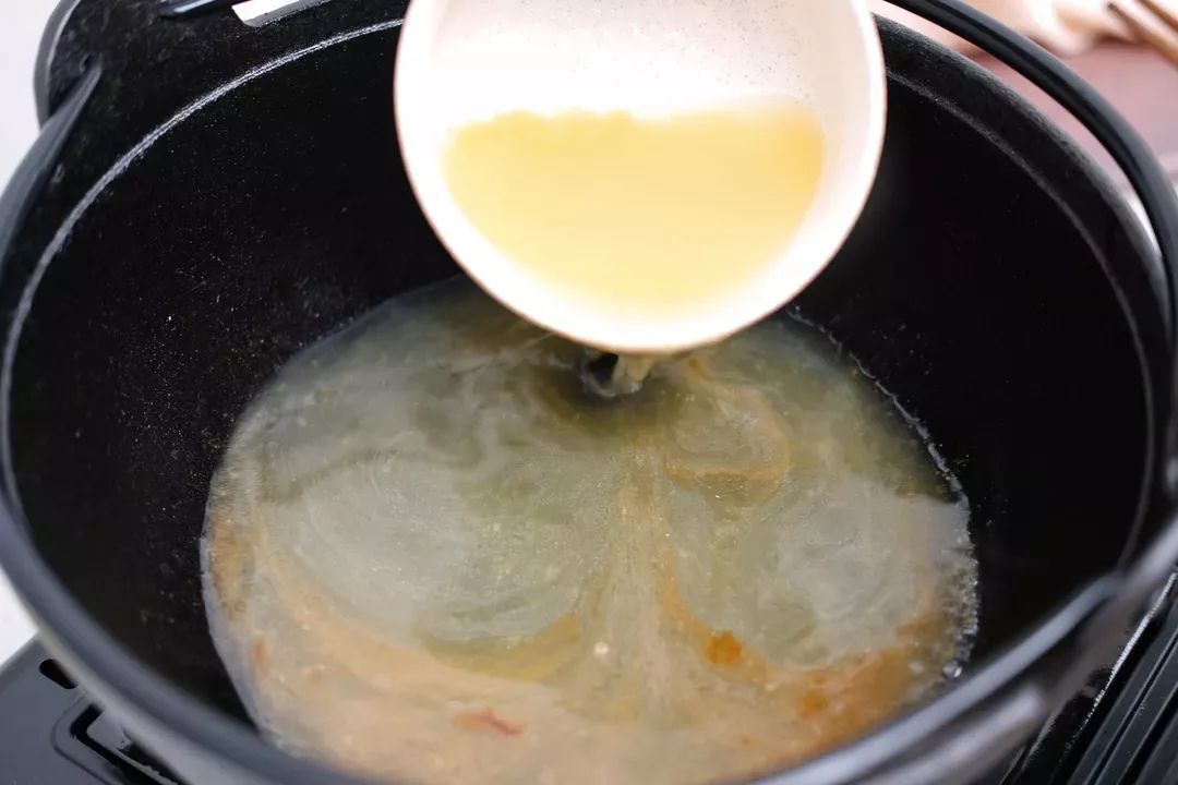 熬汁:提前熬煮好的鸡高汤过滤出来,舀5大勺的量,在一口小锅里,放入鲍鱼汁,生抽,冰糖,耗油熬煮一会儿,倒出备用。