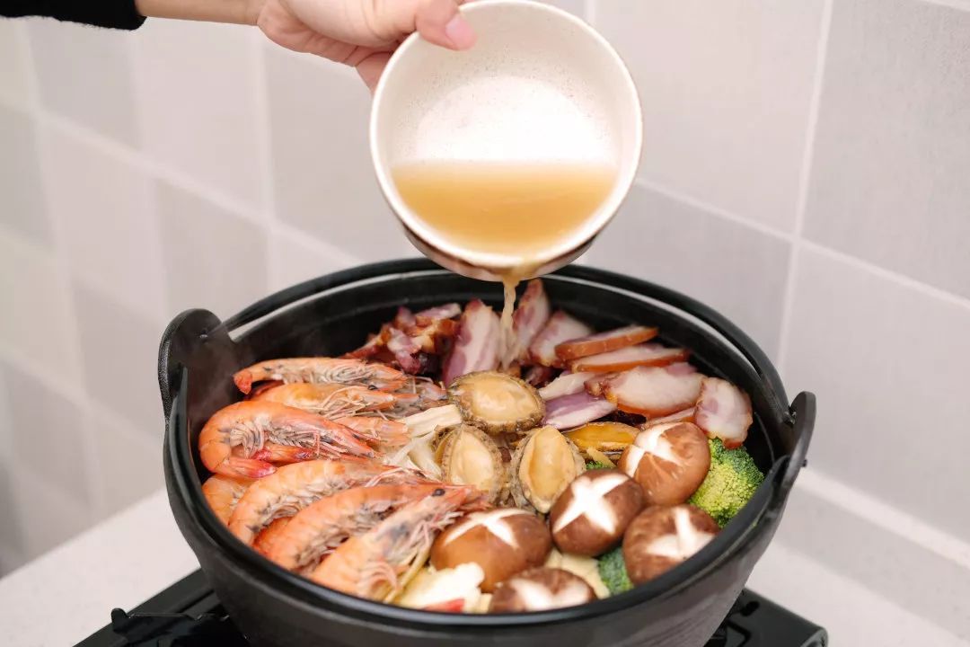 完成:将盆菜中倒满鸡汤,在表面淋上少许鲍鱼汁调味,放到电磁炉上一起上桌!一锅热腾腾又高颜值,适合全家分享的盆菜就做好了~