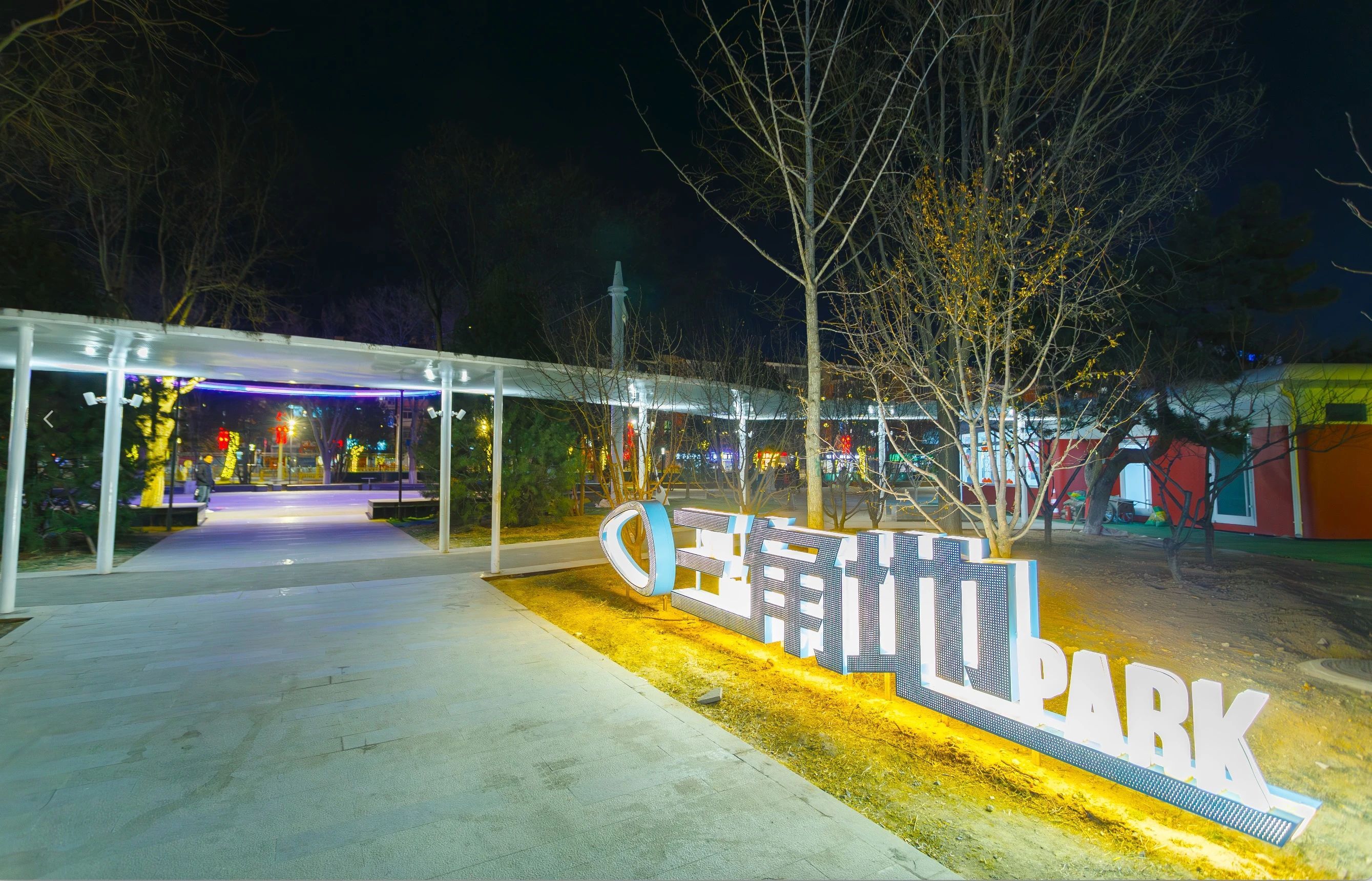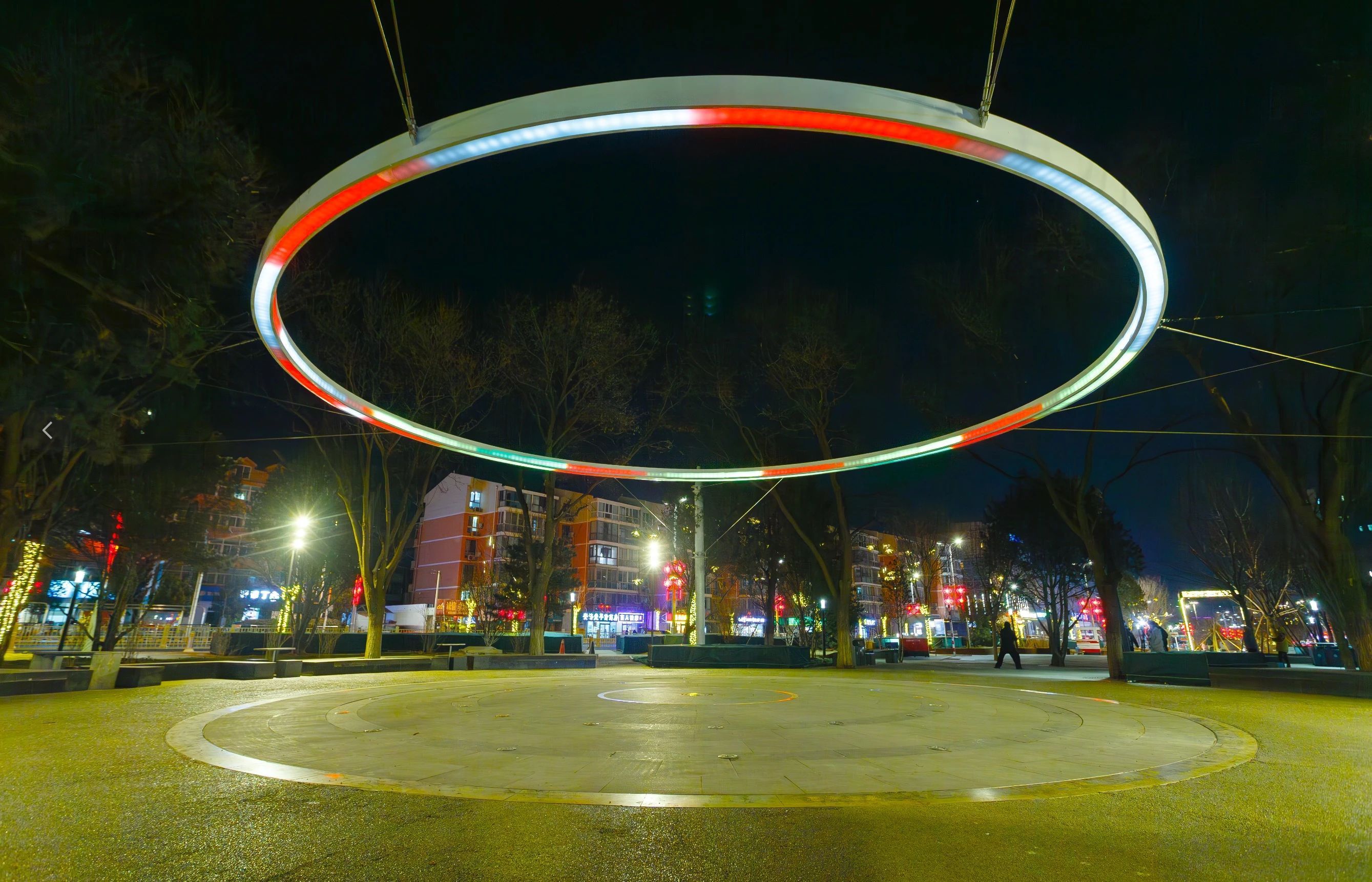 “永安之环”直径14米,与乐活广场上环形的“乐活环椅”和“昌平泉地雕”相互呼应,环环相嵌。夜晚以暖黄色柔光增添静谧氛围,轻盈的悬索环状结构融合动态的光效设计,自由而灵动,在满足功能性照明条件下,通过氛围性光影效果延长空间魅力持久度,同时灯环通过循环点亮 24 种颜色和 12 种模式,代表 24 个农历节气和一天 12 个时辰,体现中国古代传统文化关于时间和自然的节律,寓意昌平永安古城的浑厚历史。