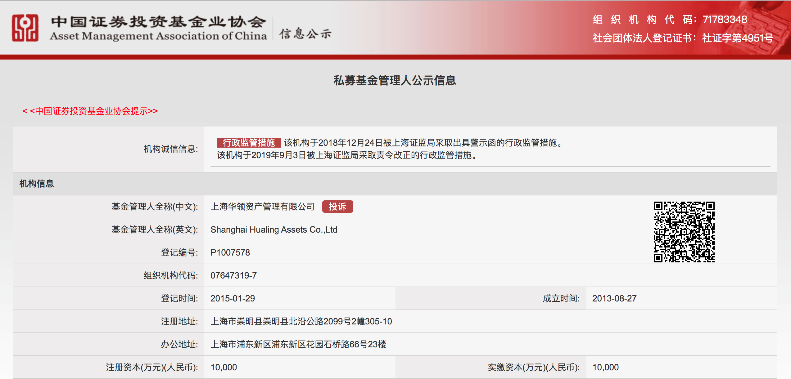 根据中基协官网,华领资产于2018年12月24日和2019年9月3日分别被上海证监局采取出具警示函和采取责令改正的行政监管措施。而根据界面新闻报道,华领资产曾因涉及“阜兴系”私募产品被伤害证监局出具警示函。