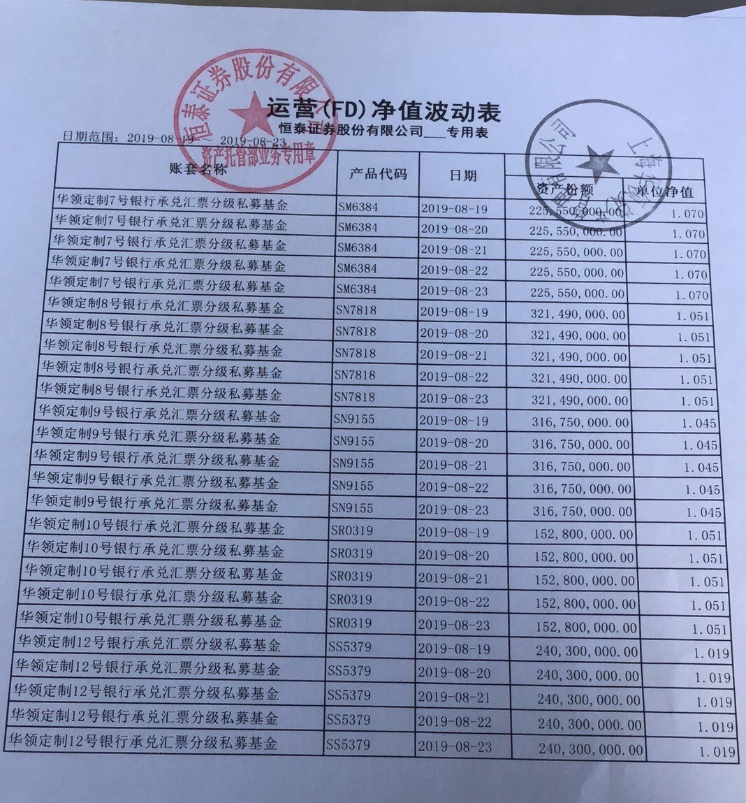 来自:时间财经王伟向时间财经展示了两张今年8月恒泰证券出具的基金净值变动表,“上面盖了恒泰和华领的印章,显示截至今年8月23日两只基金的净值仍在1以上,也就是说基金资产仍是正的,比如1.