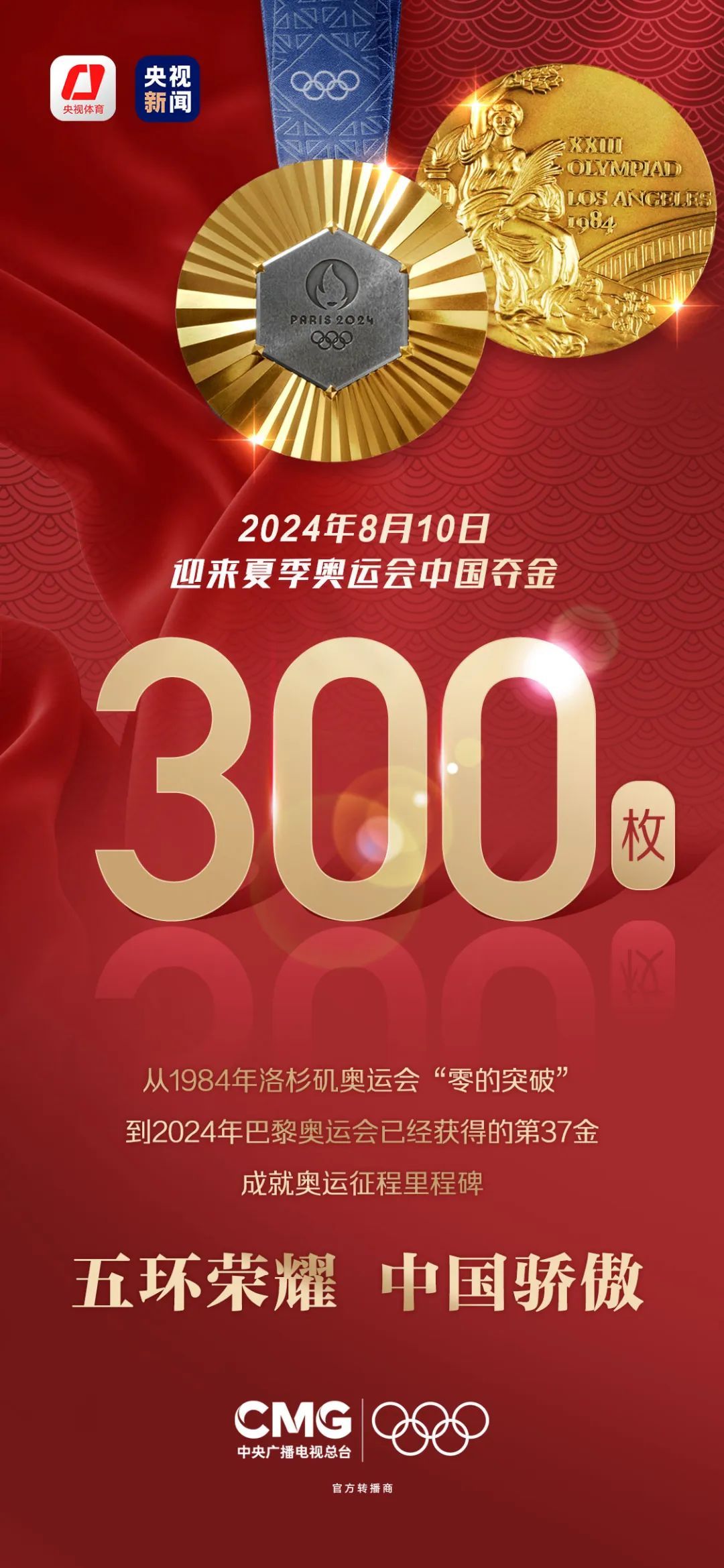 从1984年洛杉矶奥运会,许海峰射落首金,到2024年巴黎奥运会,国乒女团完成五连冠壮举。历经40年传承和几代人的付出,中国体育代表团稳步前进,从0到1,从1到10,从10到100……如今,我们见证了夏奥会300金的辉煌时代!