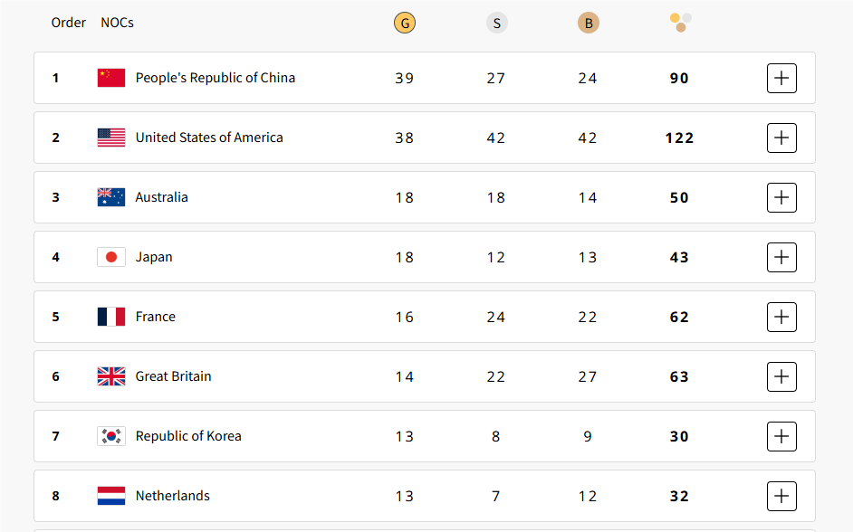 2024巴黎奥运会第十五比赛日,中国体育代表团共夺得6金1铜,是获得金牌最多的一天!目前以39金27银24铜的成绩,重回奖牌榜榜首!