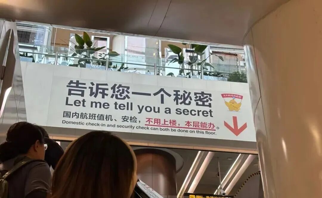 旅客乘坐地铁抵达大兴机场,拖着行李箱从B1层乘坐扶梯直奔航站楼,抬头一看,一排斗大的字挂在头顶上方:“告诉您一个秘密:国内航班值机、安检,不用上楼,本层能办。”旁边还有一个硕大的箭头。提示牌不仅“话密”、字号大,而且还像小学生做笔记划重点一样,重点提示用红字,还加了下划线。不仅如此,提示牌的英文版本也是重点提示用大号字、一般“絮叨”用小号字。