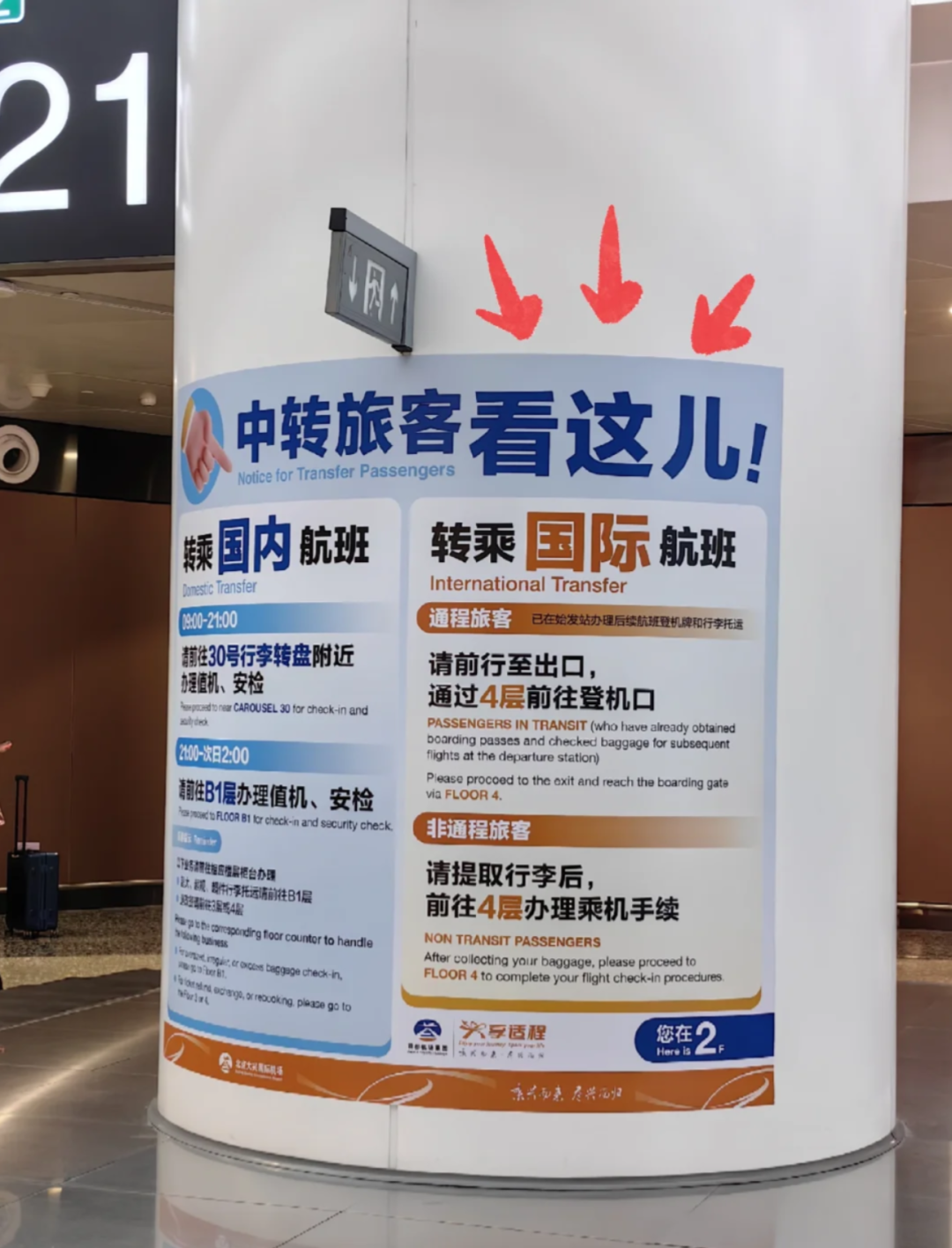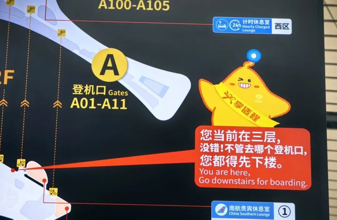 这些提示牌同样使用了大号字、彩色字体,尤其是加上那个“儿”字,给偌大的机场增添了几分亲和力。