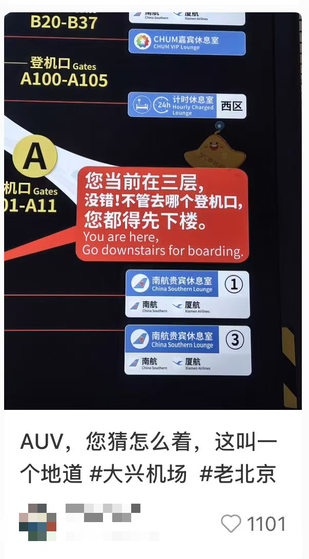 走进大兴机场,很多旅客被这些儿化音版、“絮叨”风格的提示牌吸引:“中转旅客看这儿”、“这儿是二层西出口”、“在这儿办理国内值机手续”、“您当前在三层,没错!不管去哪个登机口,您都得先下楼。”