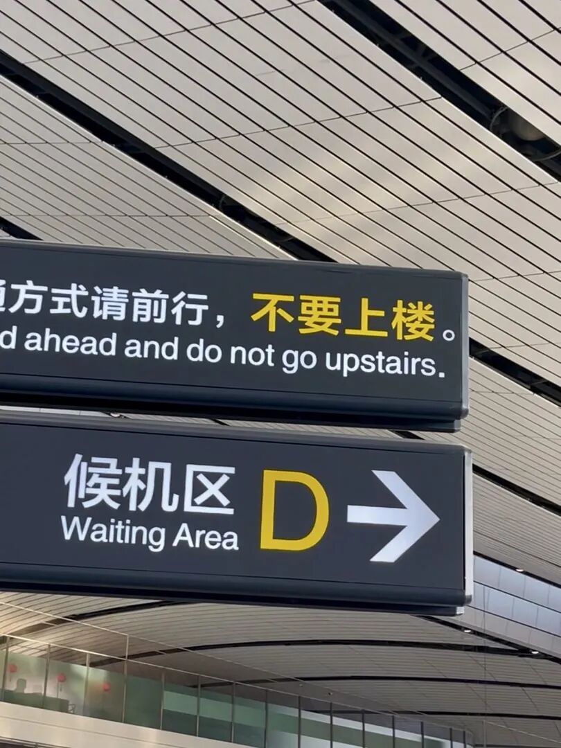 下了飞机,很多旅客选择乘坐地铁或者网约车,其他机场航站楼的提示牌大多是“网约车”“地铁”,再加一个指路箭头。但是大兴机场的网约车、地铁位置的标注就很特立独行:“搭乘地铁、网约车等各种交通方式请前行,不要上楼。”尤其是“不要上楼”这四个字,不仅字号大,还用了黄色,这句提示语文字加标点共20多个字符。