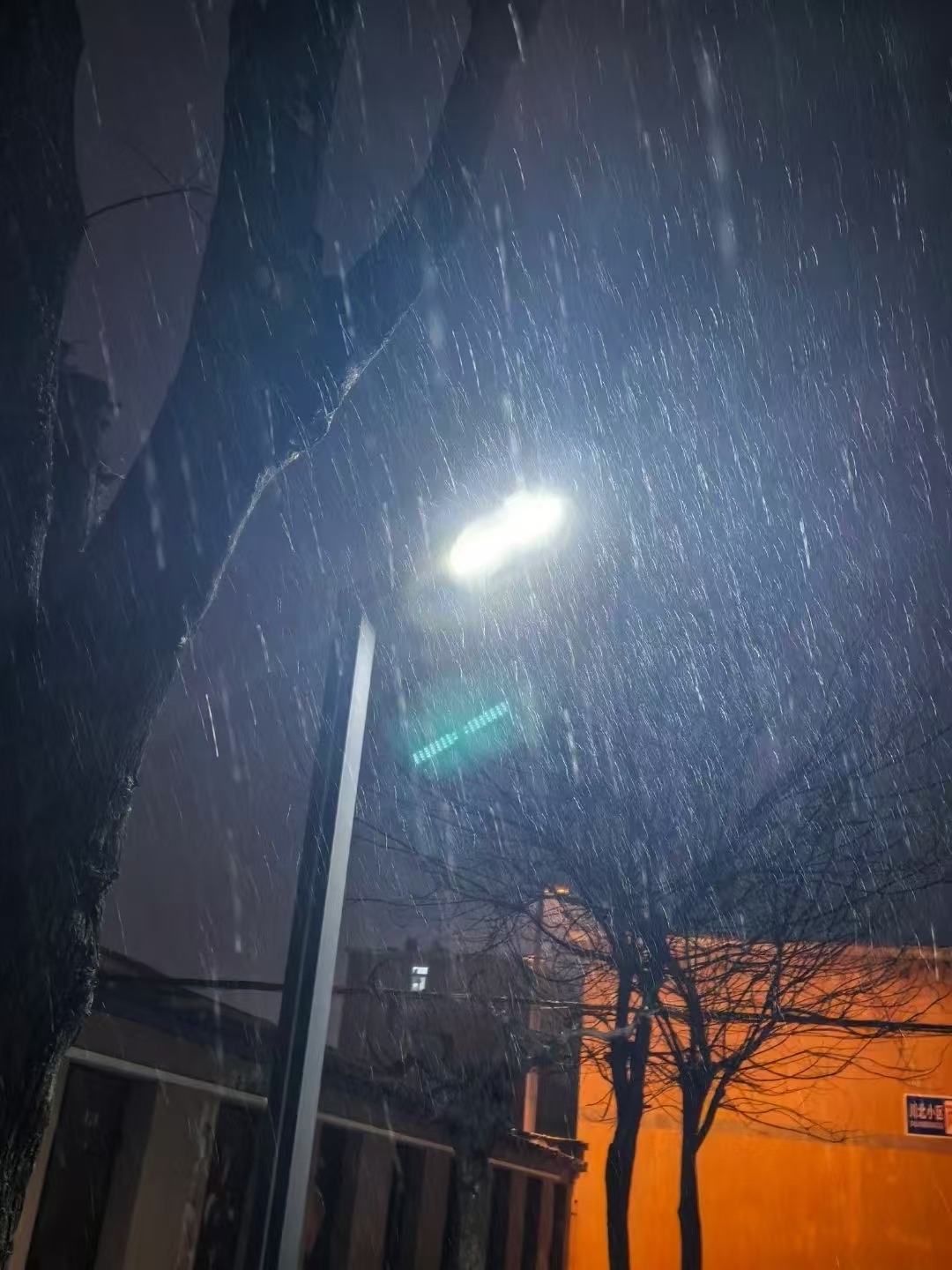 静谧的冬日夜晚里,灯光明亮,雪花洋洋洒洒地从空中飘落,轻轻地覆盖在万物之上,为城市披上了一层神秘的白纱,透露出冬日的浪漫与美好。