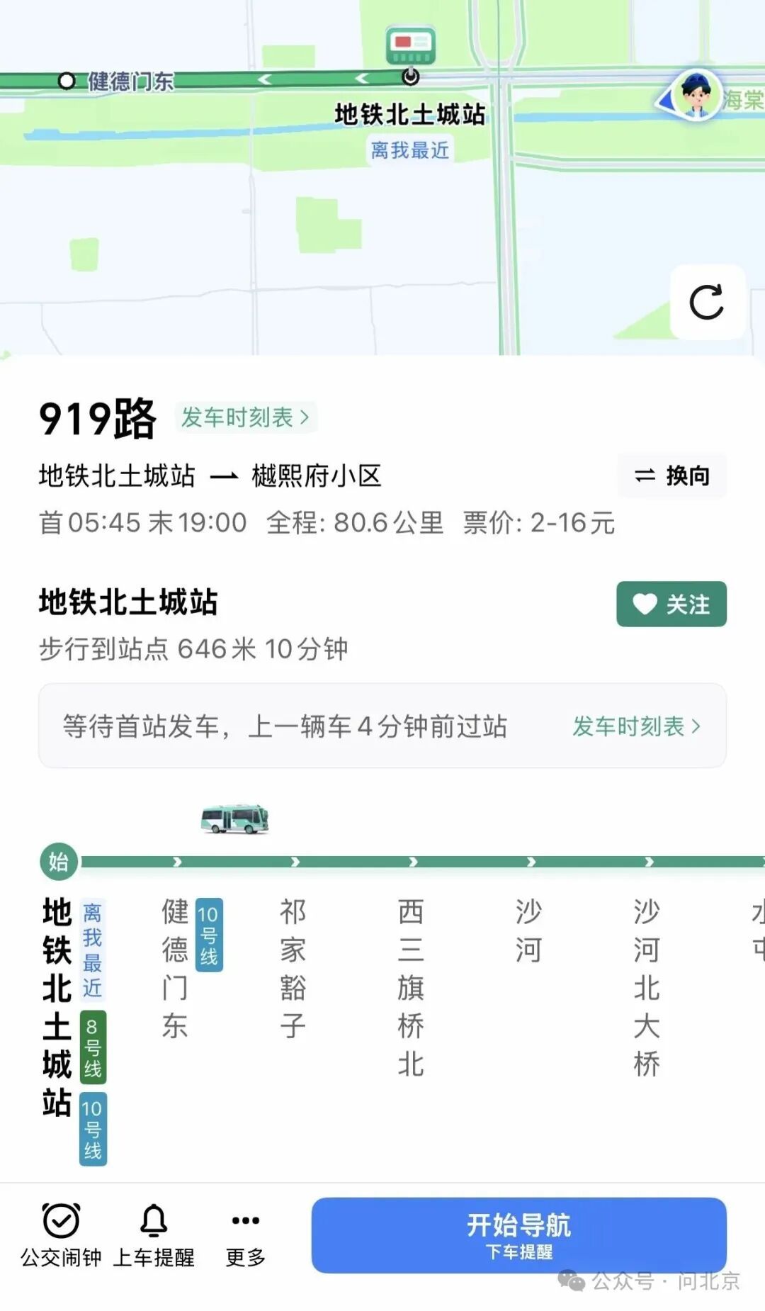 从海棠花溪内的公共厕所前往919路候车点大约需要10分钟/高德地图