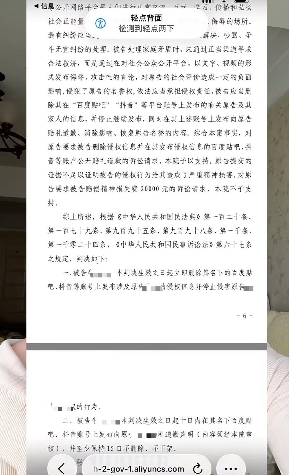在牛某某晒出的法院判决书部分内容中,记者看到,文书中称被告处理家庭矛盾时,未通过正当渠道寻求合法救济,而是通过在对社会公众公开平台,以文字、视频的形式发布侮辱、攻击性的言论,对原告的社会评价造成一定的负面影响,侵犯了原告的名誉权,依法应当承担侵权责任。判决被告牛某某删除其发布的涉及原告高某的侵权信息,并于判决生效之日起十日内在其名下百度贴吧、抖音账号上发布向原告高某赔礼道歉声明(内容须经本院审核),并至少保持15日不删除,不下架。