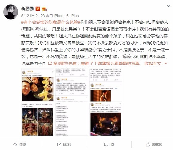 前几天蒋勤勤还专门发了个微博为老公澄清,表示:“你们姐夫不会做饭但会养家!不会打扫但会疼人 (用眼神确认过,只是较比另类)!不会甜言蜜语但会写写小诗!我们有共同的话题,共同的梦想!姐夫只在你姐面前纯真的像个孩子,只在她面前分享他的喜怒哀乐!我们相互依赖又各自独立,我们不会去改变对方的习惯,因为我们更加懂得包容!谁叫我爱上了你的才华横溢。‘爱之于我,不是肌肤之亲,不是一蔬一饭,它是一种不死的欲望,是疲惫生活中的英雄梦想。’此时此刻谁不幸福,谁就是勺子。”