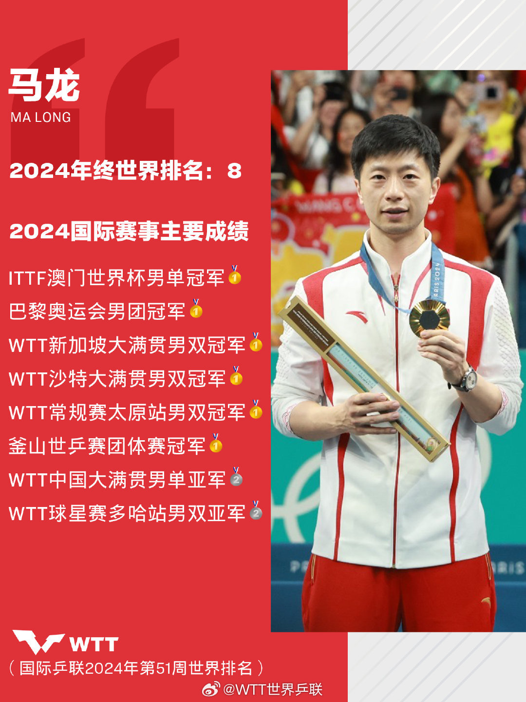 WTT世界乒联发布马龙的年度总结:世界排名:8;年度积分:3250。2024年马龙再次用实力和毅力续写了传奇,愿新的一年,无论在赛场还是生活,都收获满满的幸福与喜悦。