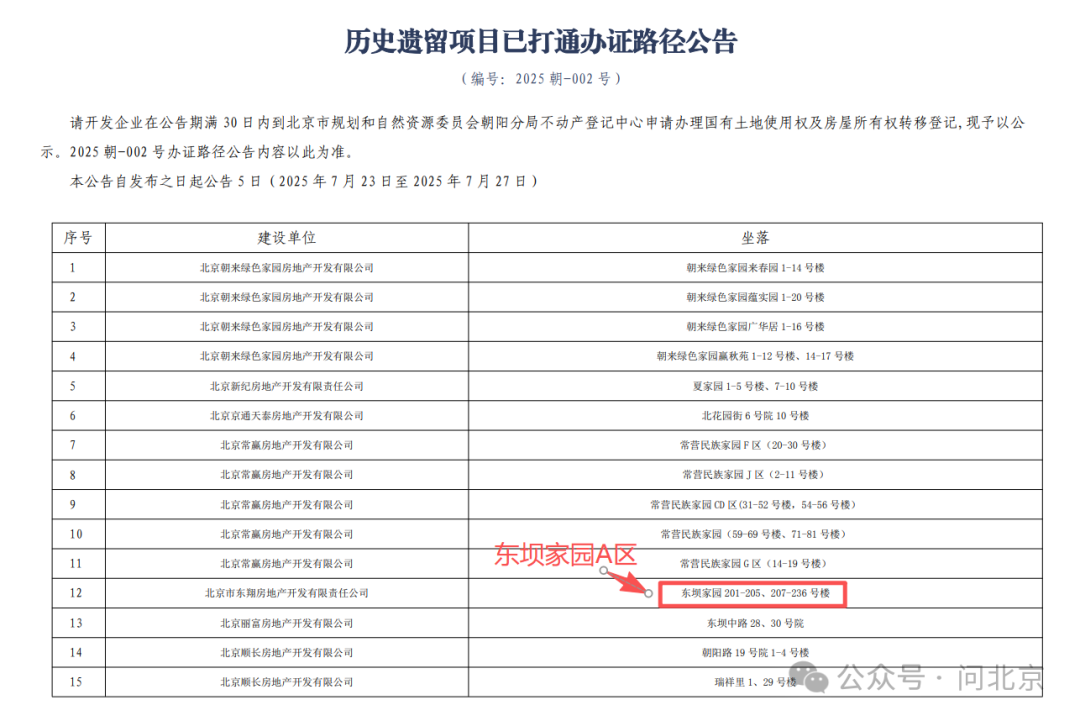 朝阳区公布的“历史遗留项目已打通办证路径公告”,其中仅包含东坝家园A区。/图源 北京市朝阳区政府网站