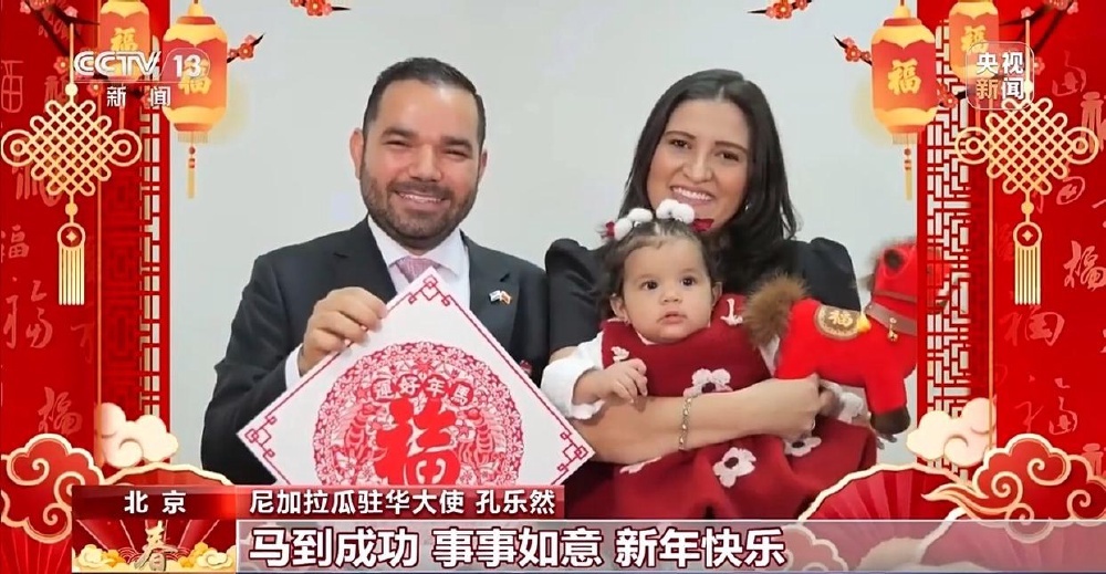 尼加拉瓜驻华大使 孔乐然:我们代表尼加拉瓜共和国、尼加拉瓜人民祝中华人民共和国、中国人民,马到成功,事事如意,新年快乐!