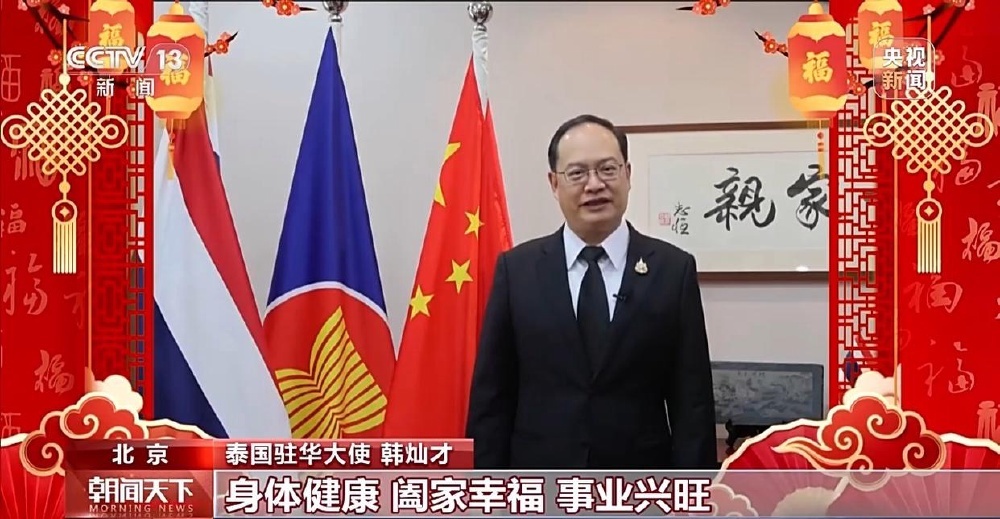泰国驻华大使 韩灿才:我谨代表泰国驻华使馆,向中国朋友们致以最热烈的节日问候,值此中国新春佳节之际,祝愿大家在新的一年里身体健康、阖家幸福、事业兴旺。愿新的一年充满奋进之力、福运绵长,新年快乐!