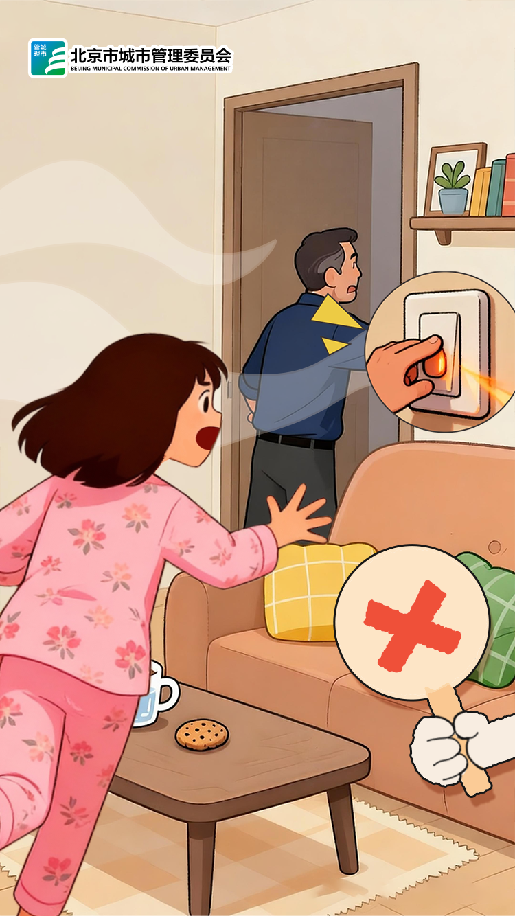 糟糕,粗心大叔发现燃气泄漏,随手按下电灯开关,这样操作有安全风险。