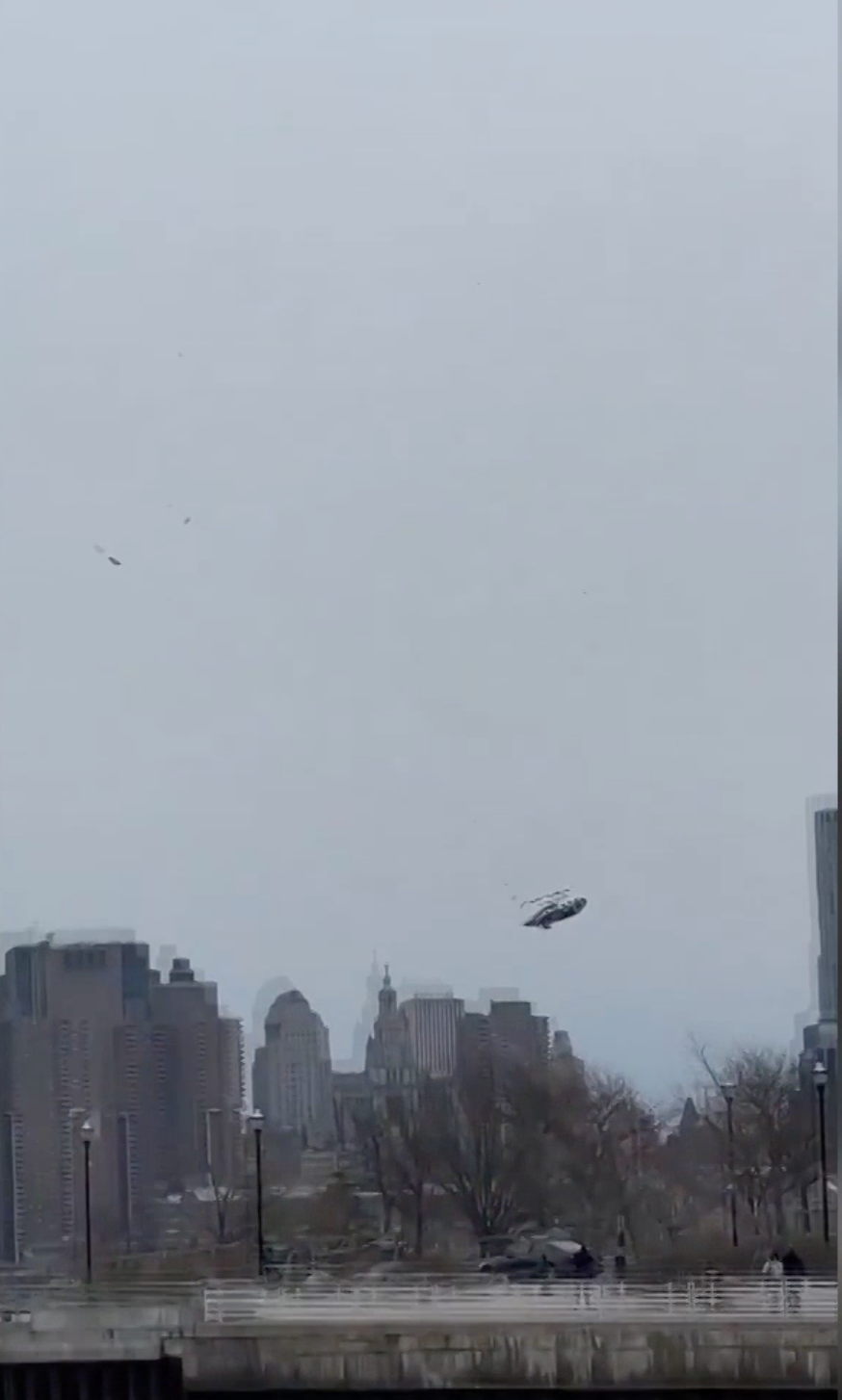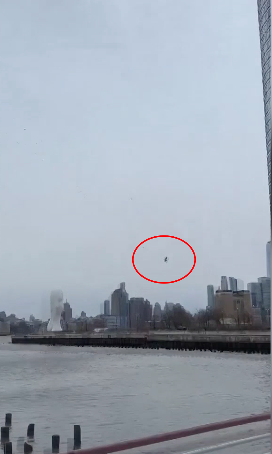 社交媒体上发布的视频显示,失事直升机尾翼和螺旋桨在空中发生脱落,与机身先后落入水中。