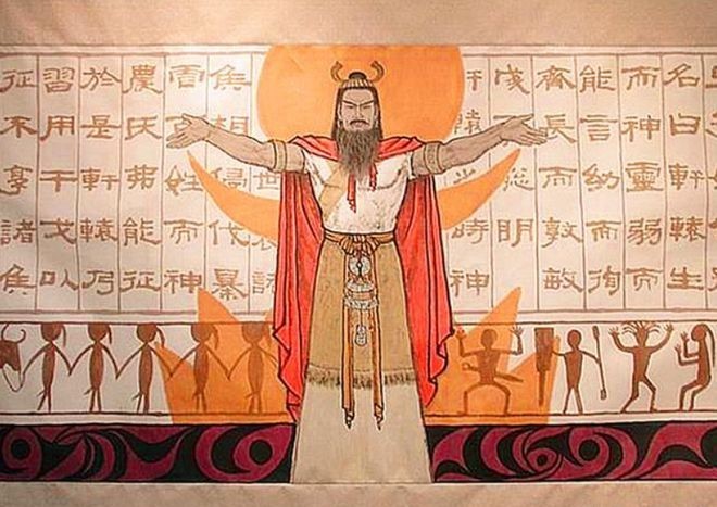 西晋皇甫谧所著的书中提到有关炎帝的起源:熊国的国君少典的妃子名叫女登。一天,女登在华亭游玩时有一条赤髯神龙乍现,神龙悬于半空中,两只眼睛发出两道神光,正好与女登的目光交接。女登似有所感,定睛一看,神龙已见首不见尾。之后她就怀了身孕,一个月之后产下的婴孩便是炎帝。