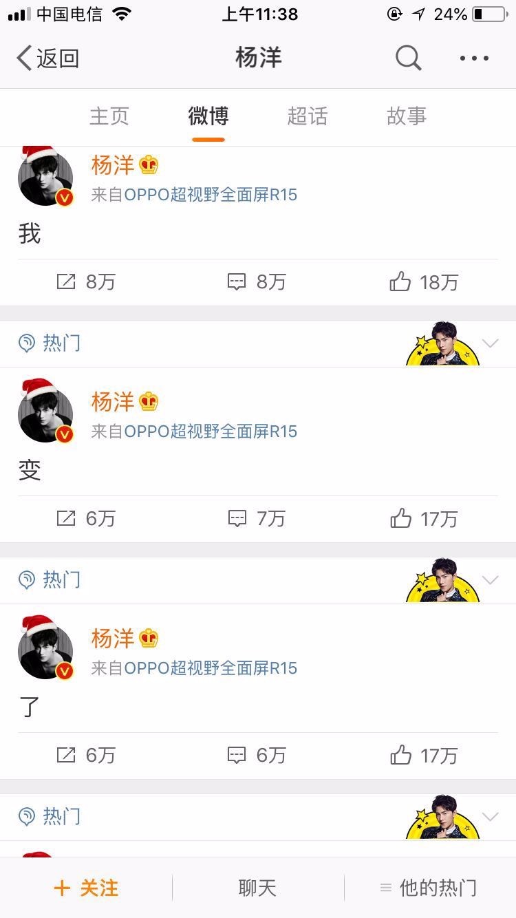 当知道自己被说变了,杨洋很调皮地连发四条单个字的微博,组成一句话“我变了吗”。