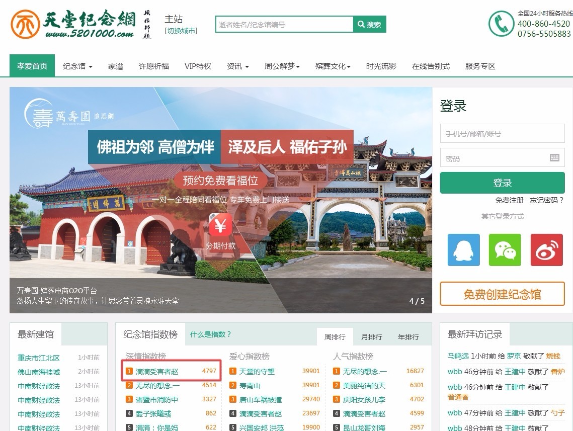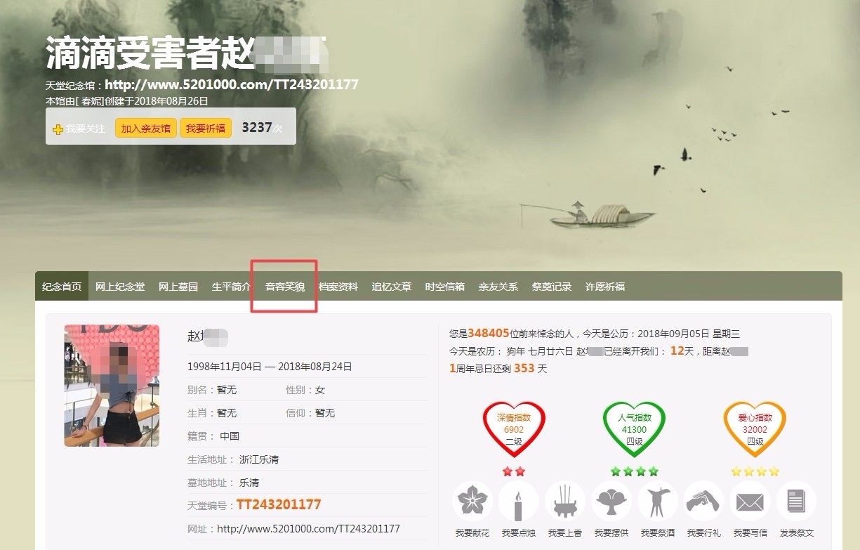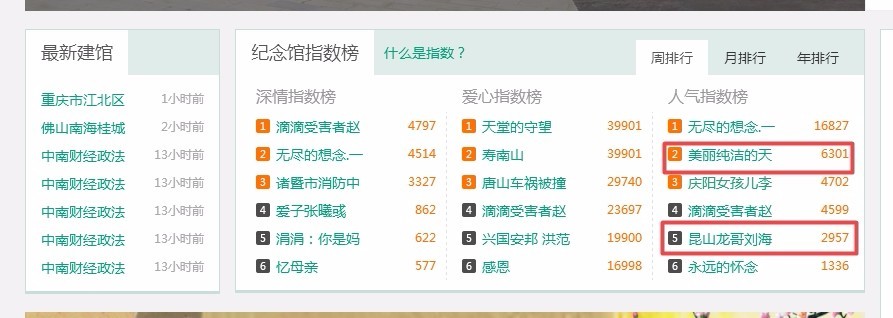 除了这个榜单,“天堂纪念网”还有“深情指数榜”以及“爱心指数榜”。一个祭祀网站竟然做成了像粉丝打榜的网站,真是令人闻所未闻。