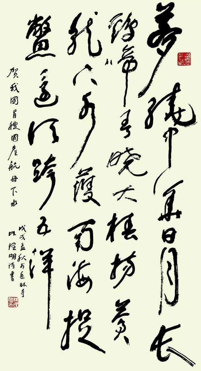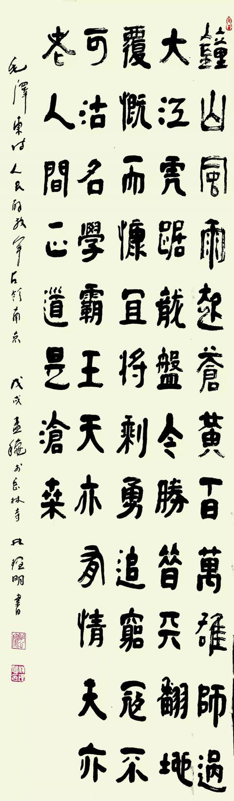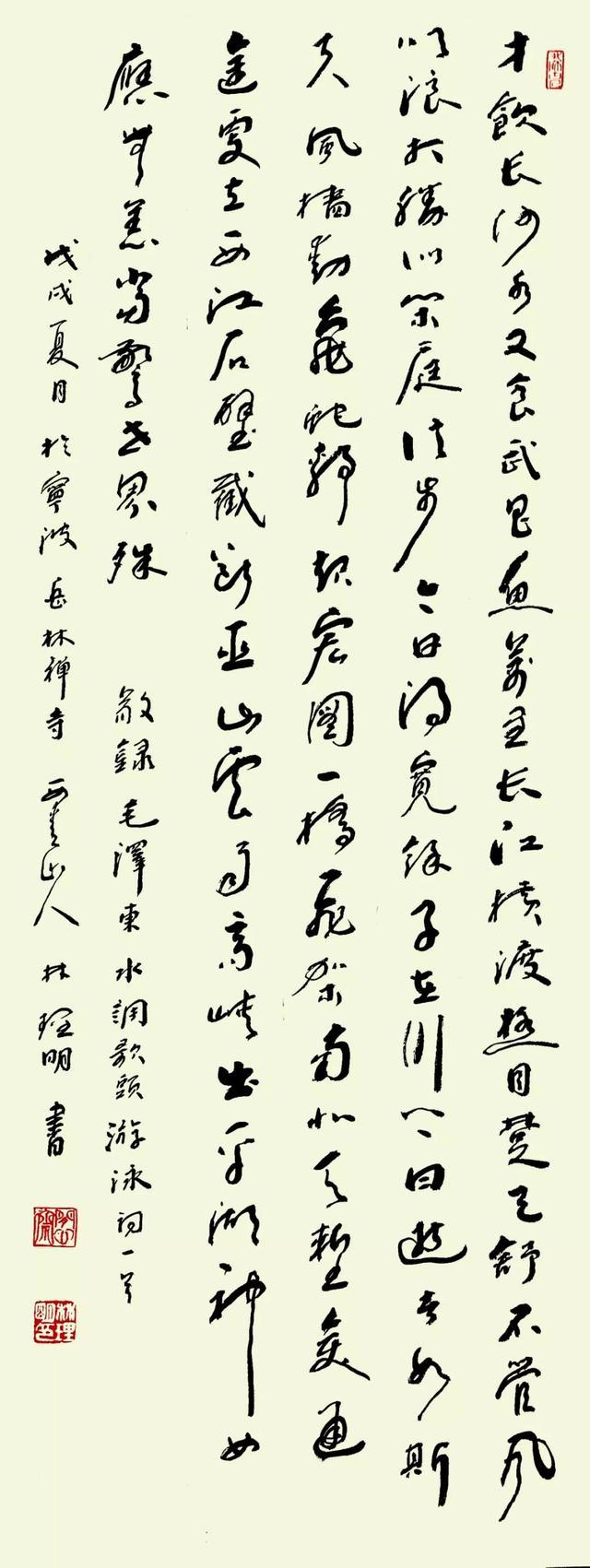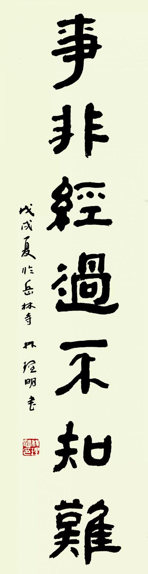 一支笔,一块墨,一张白纸,等于书法家林理明的一个世界。每当他挥毫具象形态,所要表达皆是抽象精神。因物象形质的不同,笔墨常“随类赋采”、“应物象形”且“与时俱进”。观其书作,可感受到笔墨是不规则的,发展变化的,是“有法而无法的”。随时间的推移,生活将他性情、修养的不断磨练与提高,其笔墨性情的认识与把握也会相应地得到提高,书法成为他真性情的写照,心手双畅,物我两忘,天人合一,是一种至高的境界。