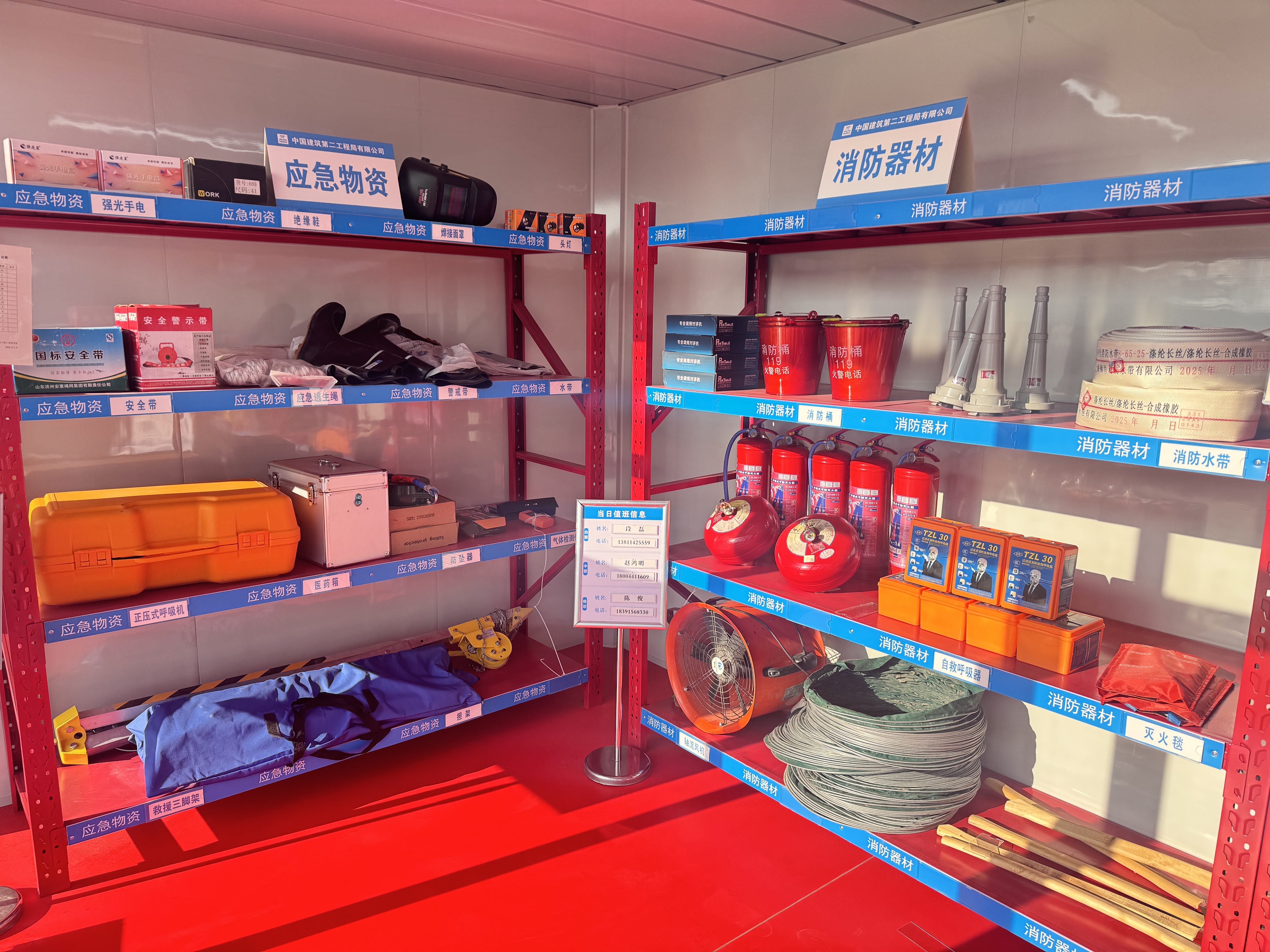 工地一旦出现火情,救援倘若不及时,火势蔓延可能造成无法挽回的后果。为保障施工现场消防安全,提高灭火救援速度,丰台区消防救援支队与区住建委携手,在工地建造了一座功能完备的微型消防站。消防站内配备足量ABC类干粉灭火设备,全面覆盖常规火情;同时备有消防沙、灭火毯、防火布、消防锹、消防桶,可应对油类、电气等不同性质的初起火灾。站内为每位队员配齐防火服、消防头盔、消防鞋,自救呼吸器及正压式空气呼吸器等,保障队员在轻微危险环境下的处置安全。站点直接接入项目临时消防水管网,确保水源稳定充足,现场配备的消防水带、高压水枪均按规范摆放;同时备有消防斧、应急照明灯、应急逃生绳、救援三脚架、担架、防坠器等破拆与疏散器材,满足火情处置中的破障、救援需求。