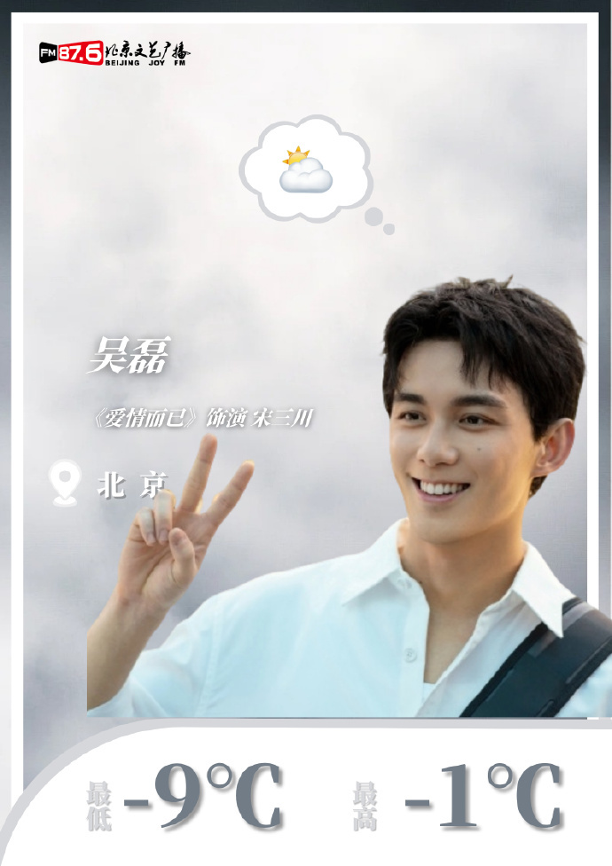 早安!本期“天气播报员”是《爱情而已》中的宋三川@吴磊LEO 北京今日白天晴,气温-9°~-1°。 祝大家拥有美好的一天!
