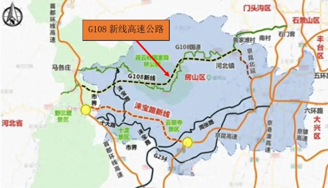 房山区108新线高速公路东起青龙湖镇,与京昆高速相接,西至市界,全长约60公里,该高速采用双向四车道设计,设计速度为80公里/小时。全线设41座桥梁、20处隧道、9座互通立交,桥隧比高达88%。