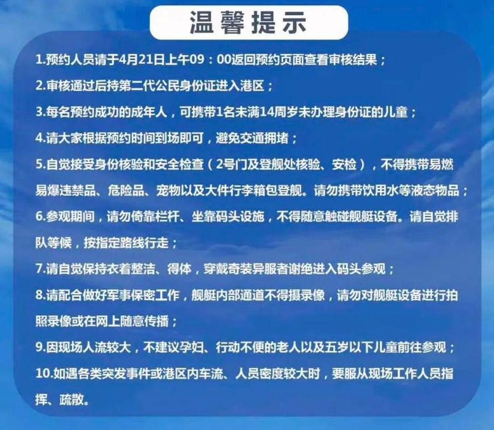 线上预约采取实名制,所有预约人员均以第二代居民身份证信息为准;为满足更多群众的参观需求,整个活动期间,每人限预约参观1次;每名预约成功的成年人,可携带1名未满14周岁未办理身份证的儿童。人员信息核验约需2个工作日,预约人员请于2026年4月21日09:00时登录“仙游蓬莱”小程序预约页面查看审核结果;审核通过后,请持身份证原件按预约时间经安检核验后,登舰参观。