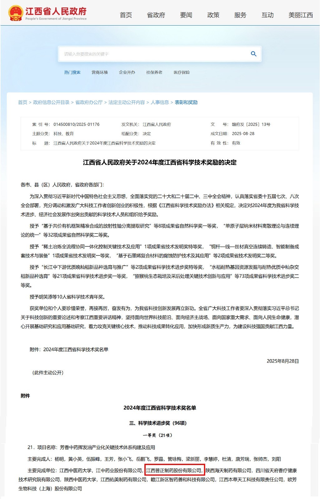 2025年8月28日,江西省人民政府发布关于2024年度科学技术奖励的决定(赣府发〔2025〕13号)。由江西中医药大学牵头,江西普正制药股份有限公司与多家单位联合完成的“芳香中药挥发油产业化关键技术体系构建及应用”项目,荣获2024年度江西省科学技术进步奖一等奖。