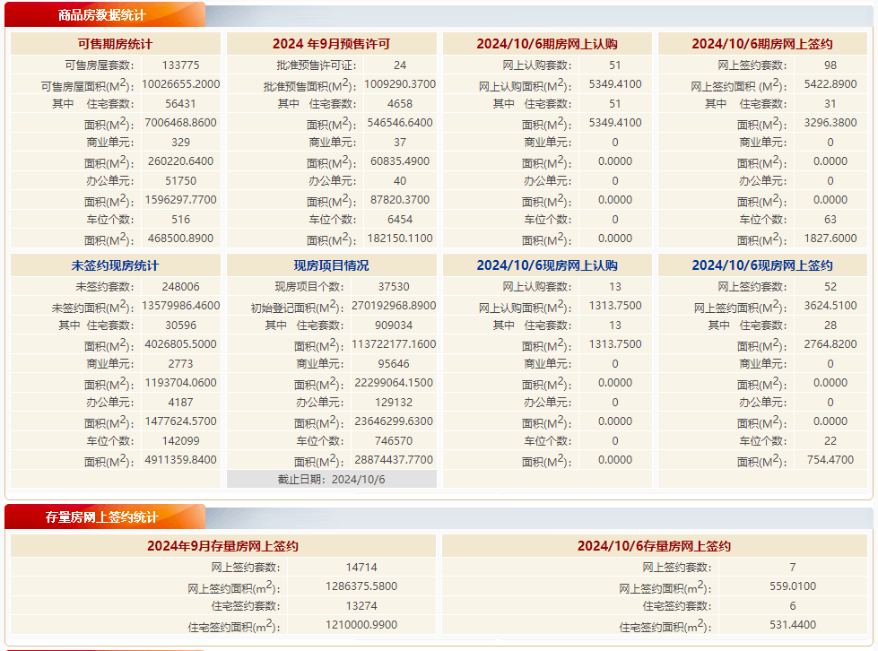 根据北京市住房和城乡建设委员会数据:10月6日,北京新房住宅网签59套,网签面积约6,061.2㎡;二手房住宅网签3套,网签面积约531.44㎡。