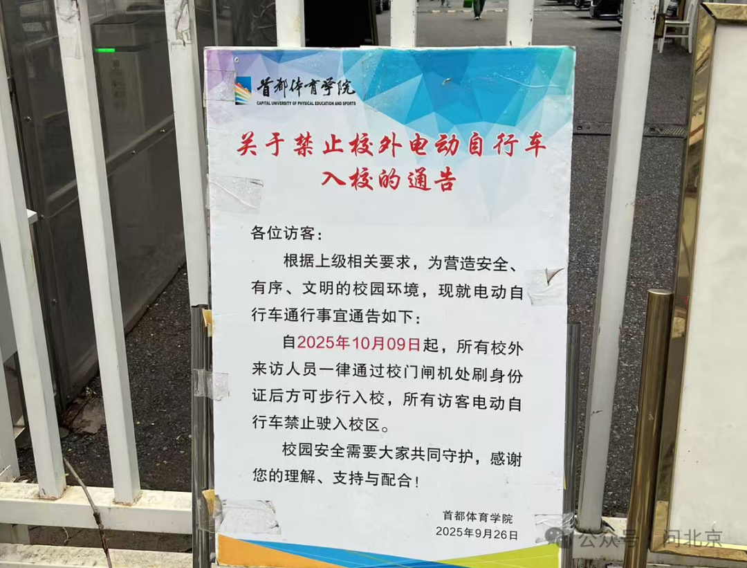 从罗庄南里小区的南门步行十几米,就是首都体育学院的北门,在学院门口,记者看到一张公告,上写着“自2025年10月9日起,所有校外来访人员一律通过校门闸机处刷身份证后方可步行入校,所有访客电动自行车禁止驶入校区。”