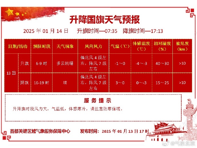 新闻链接:1月14日天安门地区升降国旗天气预报