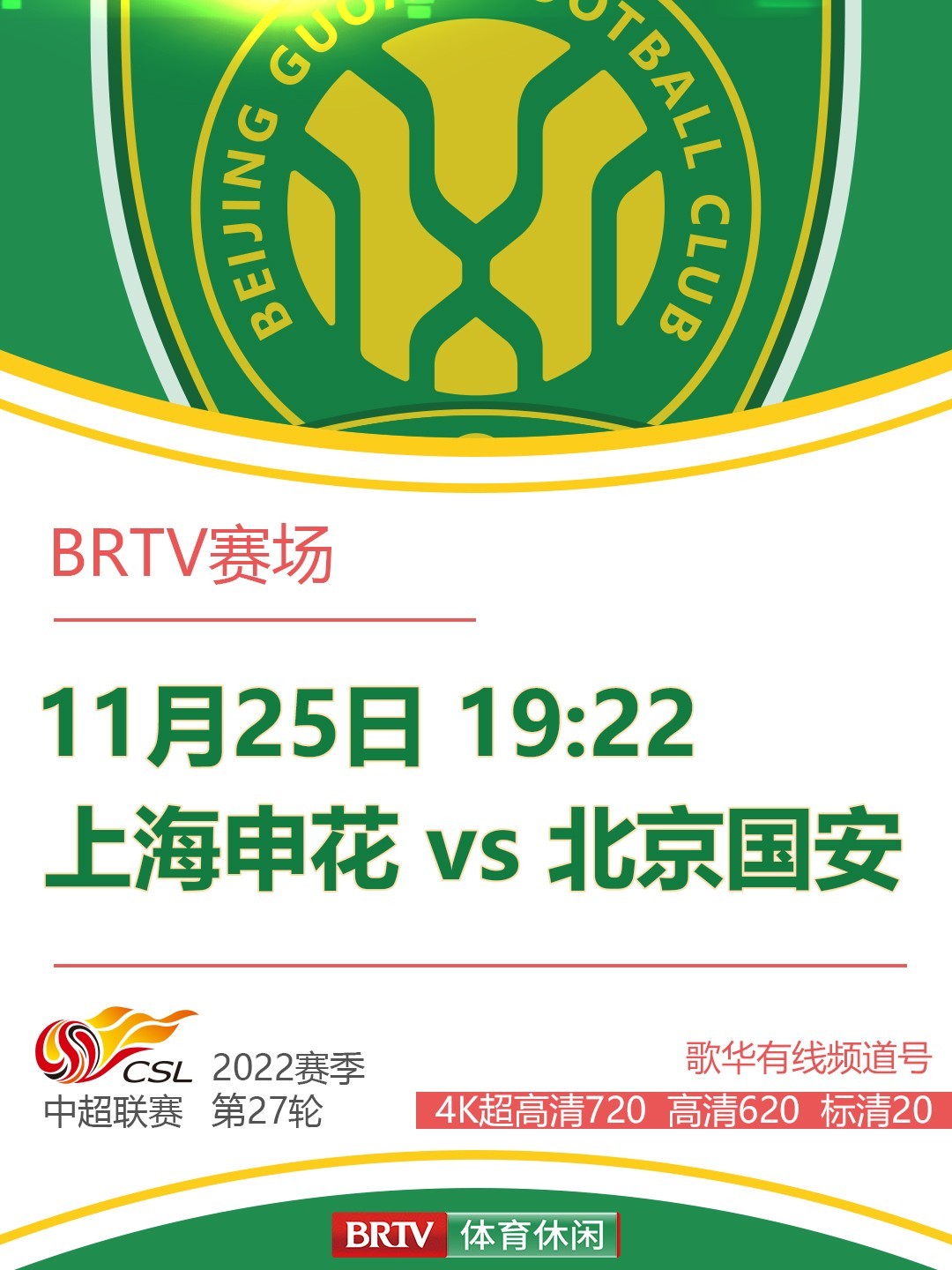 25日19:30 上海申花VS北京国安 BRTV体育休闲频道转播