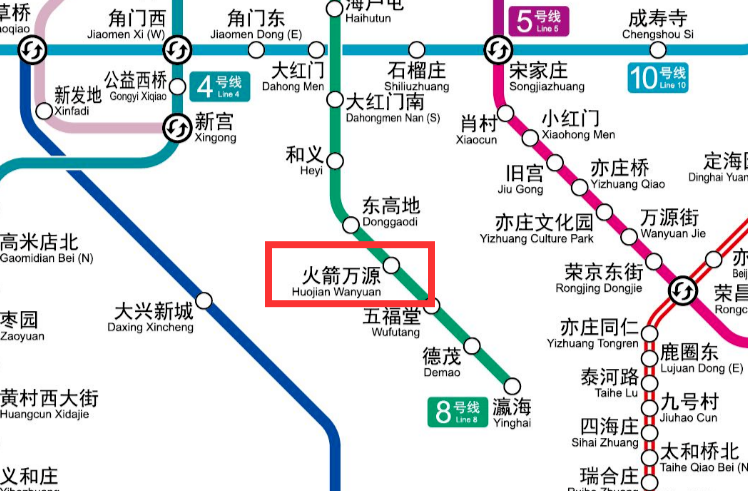 因火箭院已成为区域性称谓,指位性强,故结合历史上的“万源庄”之名,取名“火箭万源站”,亦取中国航天事业发祥地之意。