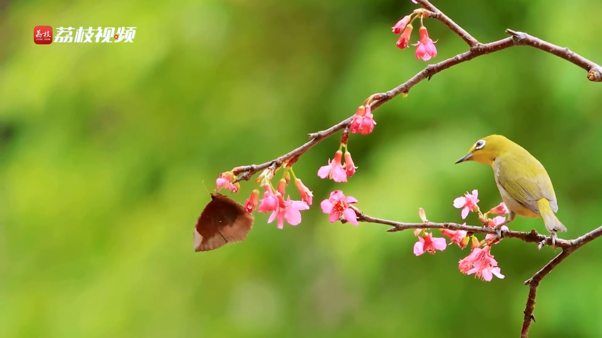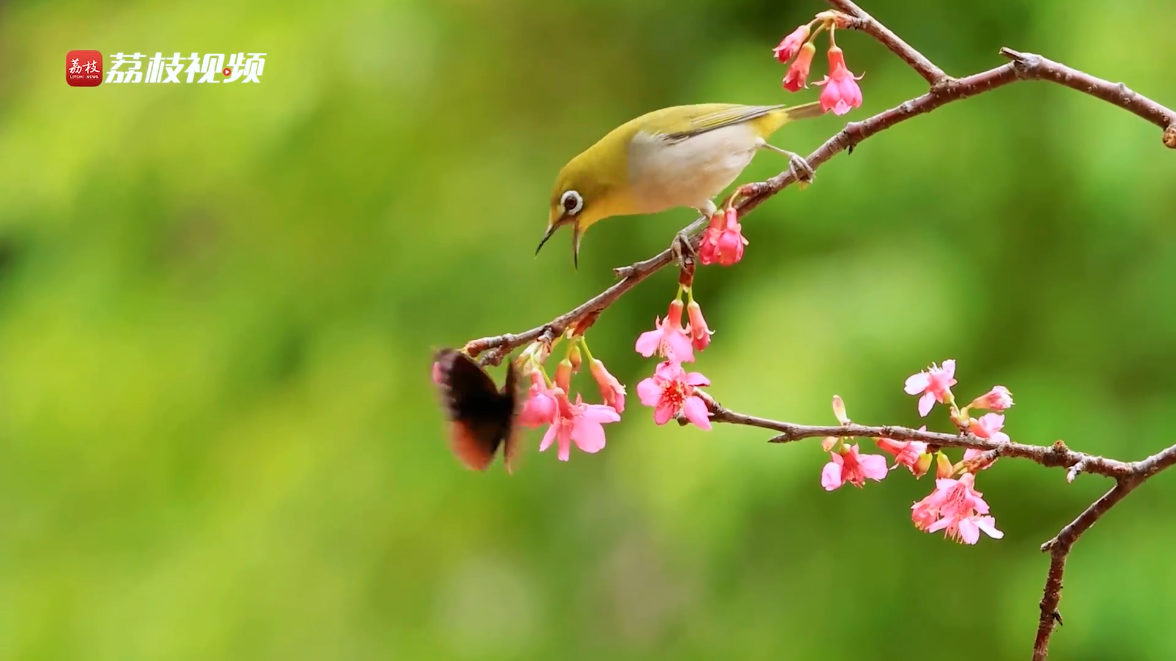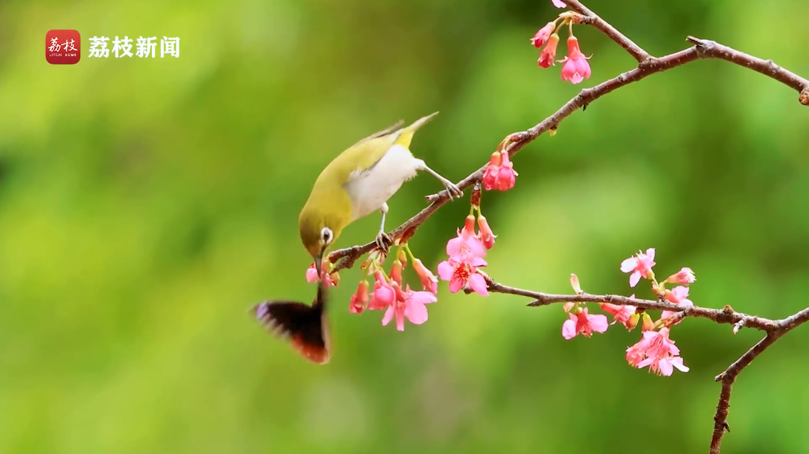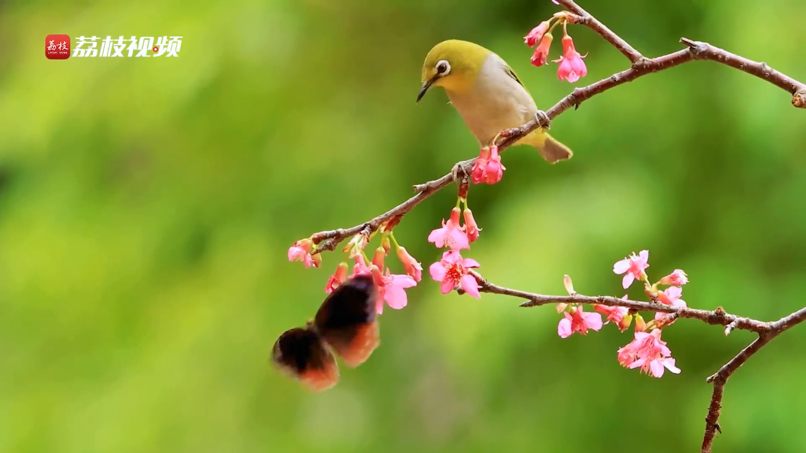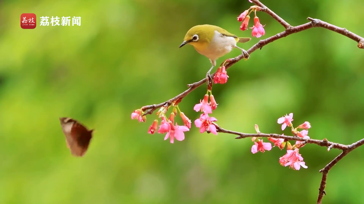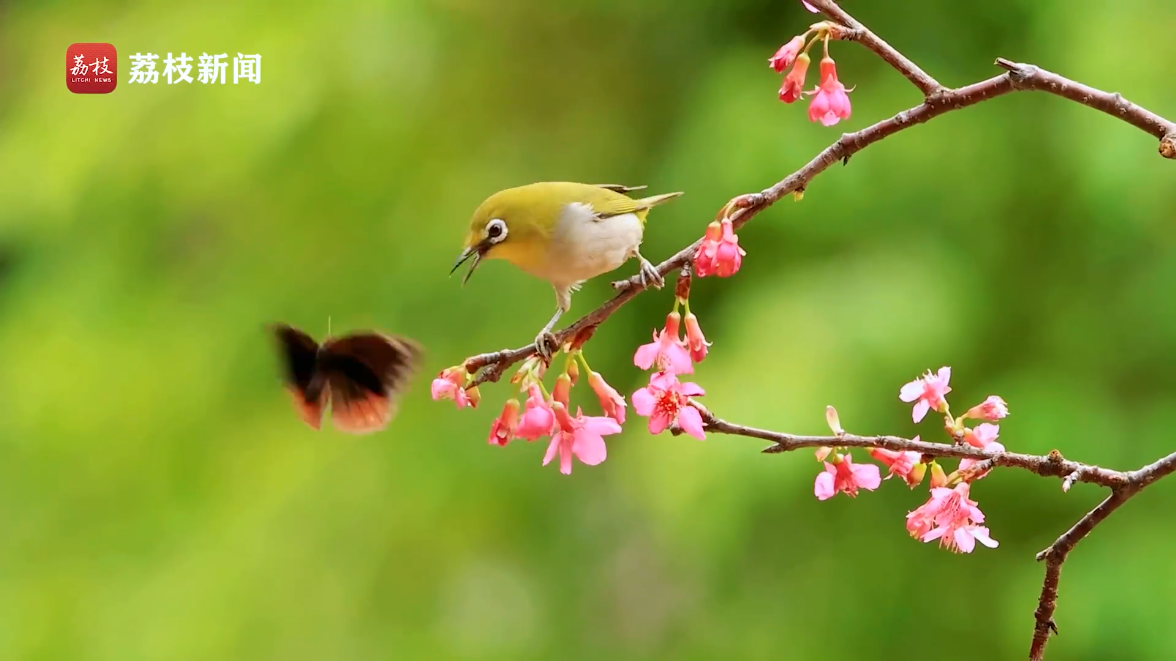 近日,深圳仙湖植物园内樱花盛开,如粉似霞,绣眼鸟和蝴蝶闻香来抢食。绣眼鸟三番五次地啄走蝴蝶,而蝴蝶也不甘示弱,流连忘返飞舞于枝头,“见缝插针”地享用美味。两个小家伙上演了一场“蝶鸟争霸战”,妙趣横生,好似一幅动起来的中国花鸟画。
