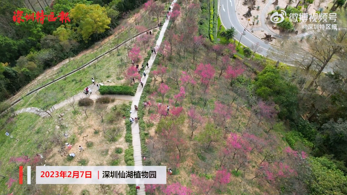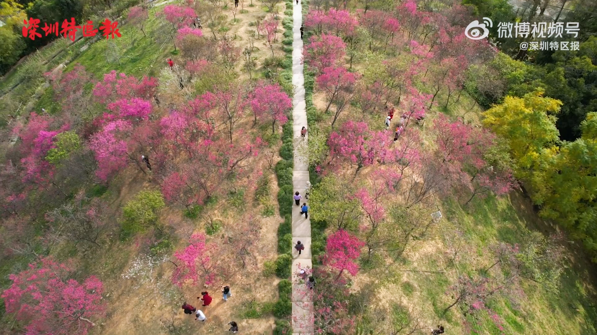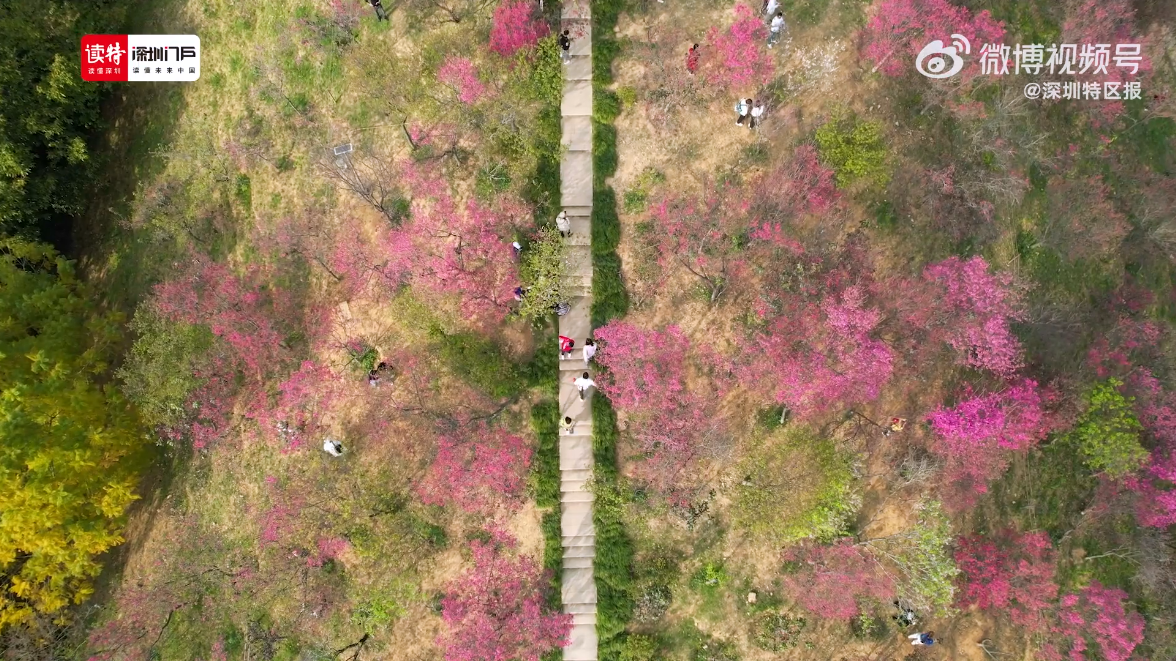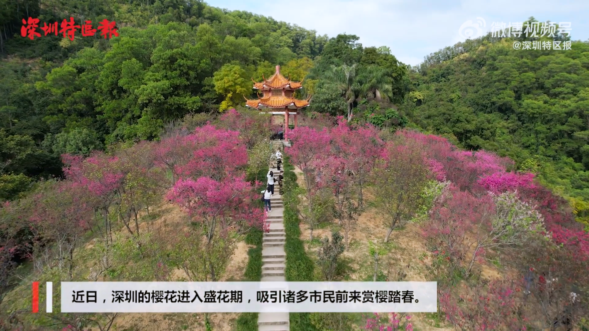 深圳的樱花进入盛花期,在春风的吹拂下,花开满枝头,唯美而浪漫,吸引诸多市民前来赏樱踏春。从仙湖植物园的化石森林漫步至桃花园,拾阶而上,于山顶桃花亭望去,近千棵花树已绚丽绽放。前来赏花的市民说,相比国内不少地方,这里的樱花花色更艳丽。