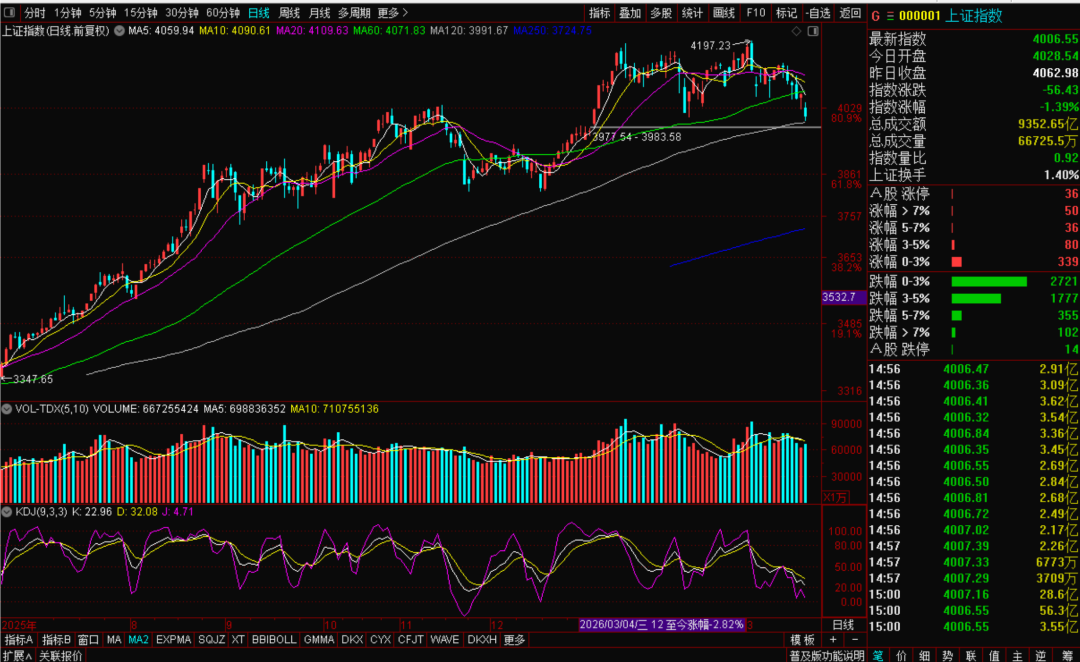 受隔夜美股大跌影响,今天外围市场普跌,A股承压调整,沪指一度失守4000点,逼近半年线,超过5000只个股飘绿,成交量能。