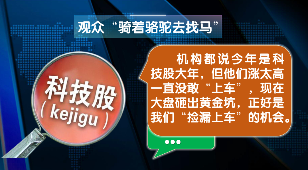 观众“骑着骆驼去找马”说:机构都说今年是科技股大年,但它们涨太高一直没敢“上车”,现在大盘砸出黄金坑,正好是我们“捡漏上车”的机会。