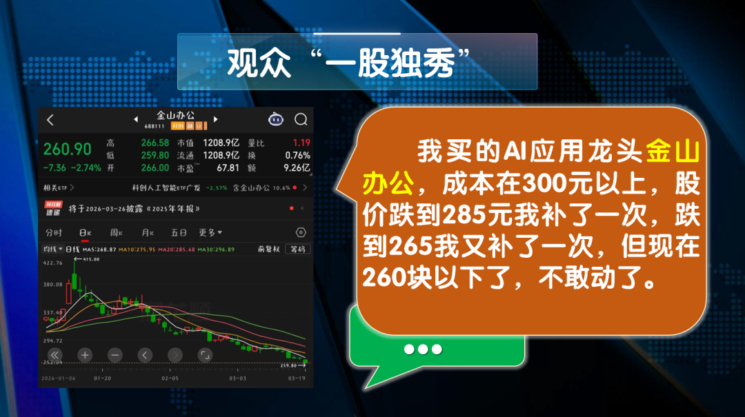 比如观众“一股独秀”:我买的AI应用龙头金山办公,成本在300元以上,股价跌到285元我补了一次,跌到265块钱我又补了一次,但现在260元以下了,不敢动了。
