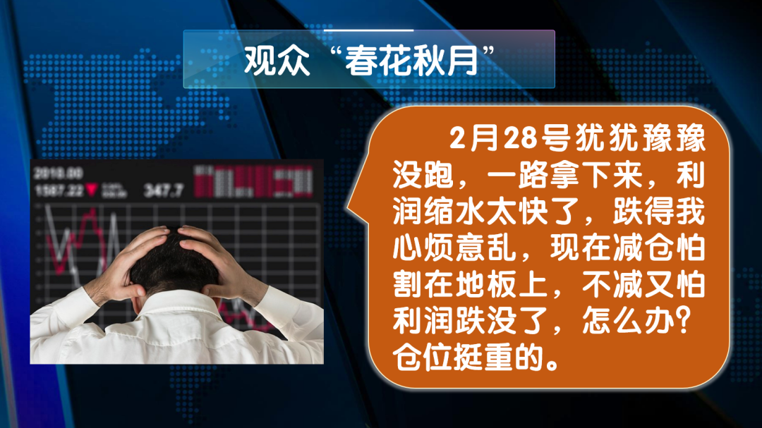 网友“春花秋月”:2月28号犹犹豫豫没跑,一路拿下来,利润缩水太快了,跌得我心烦意乱,现在减仓怕割在地板上,不减又怕利润跌没了,怎么办?仓位挺重的。