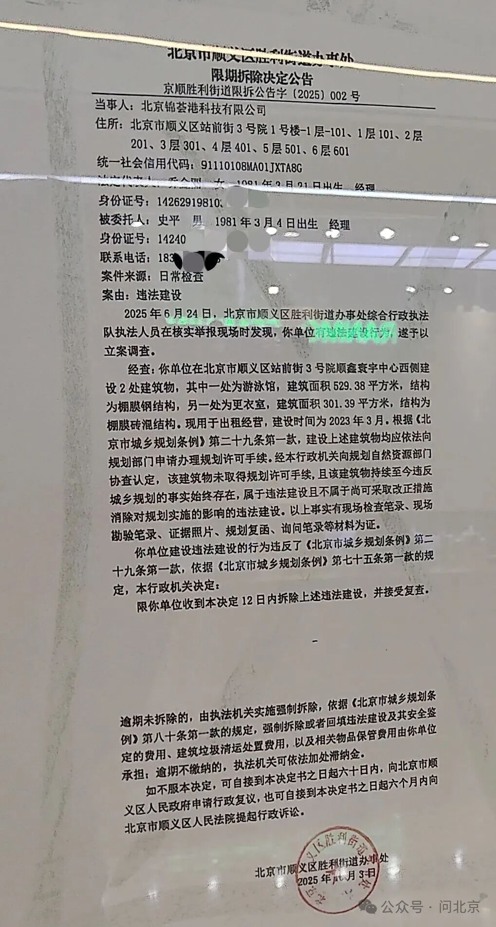 顺义区胜利街道办事处10月3日向锦荟港物业——北京锦荟港科技有限公司发出的这份公告显示,综合行政执法队执法人员在核实举报现场时发现,2023年建设于锦荟港西侧用于出租经营的游泳馆和更衣室,面积共计800多平方米,建筑物为棚膜钢和棚膜砖混结构,没有取得规划许可手续,属于违法建设,须限期拆除。