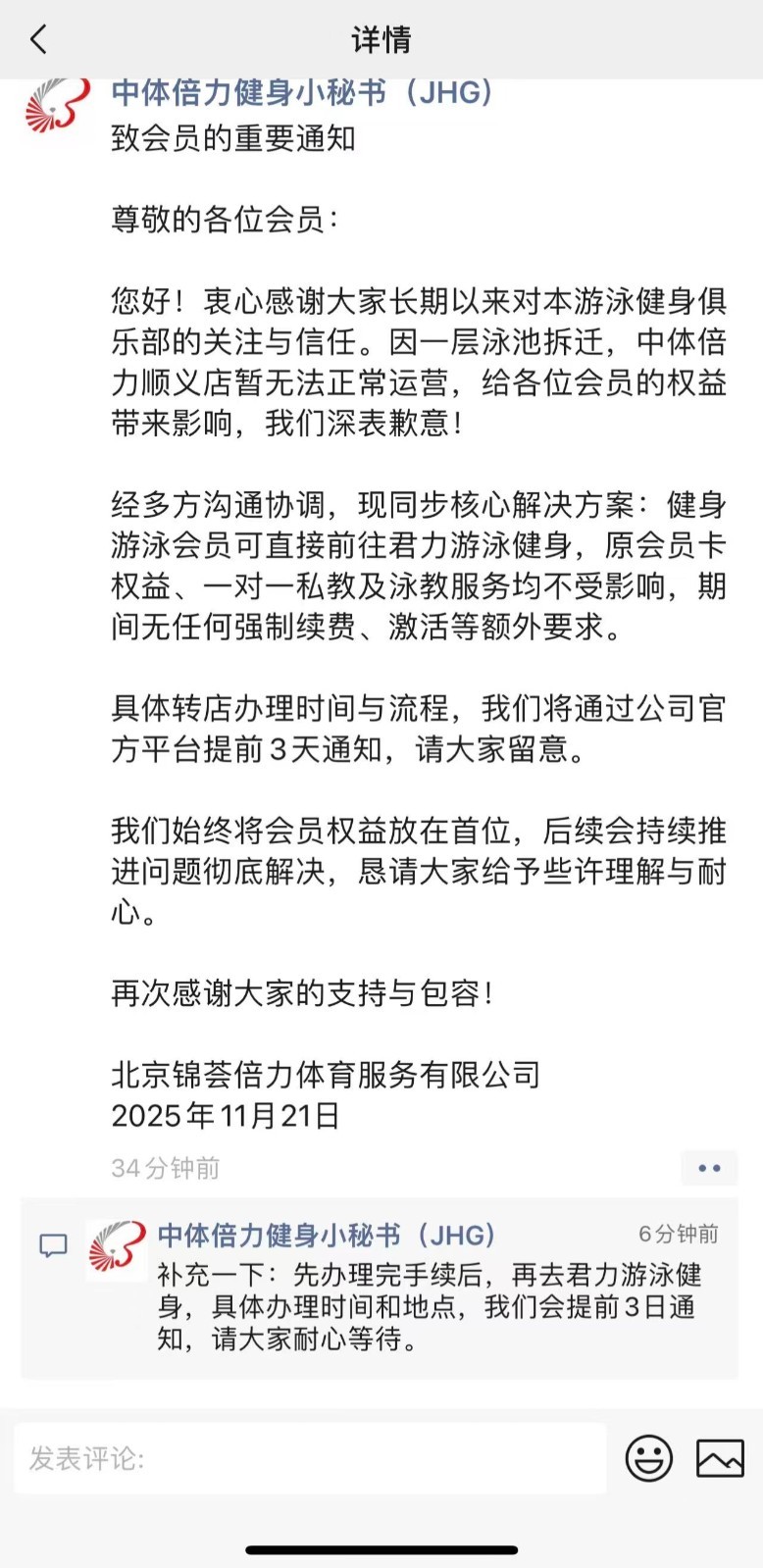 经过一个多月的焦急等待,解决方案于11月21日晚出炉。健身房方面提出转课方案,消费者可将剩余课时无偿转到距离锦荟港近4公里的君力游泳健身,原会员卡权益、一对一私教及游泳服务均保持不变,无任何强制续费或激活要求。