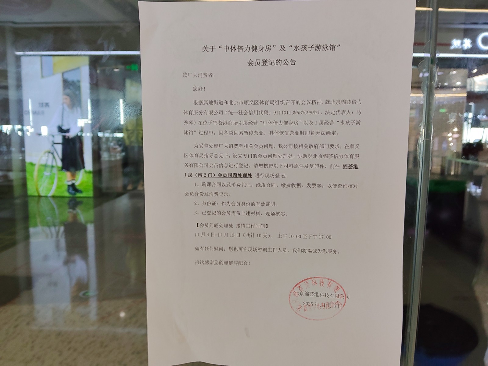 北京市顺义区的锦荟港是以儿童业态展开核心布局的商业综合体,2022年开业。中体倍力游泳健身(锦荟港店)后续入驻,凭借四楼的“中体倍力健身房”和一楼的“水孩子游泳馆”,吸纳了大量会员。给孩子报名游泳课的赵女士(化姓)就是其中之一。然而,今年“十一”之后,这家热门游泳馆突然发出停业通知。