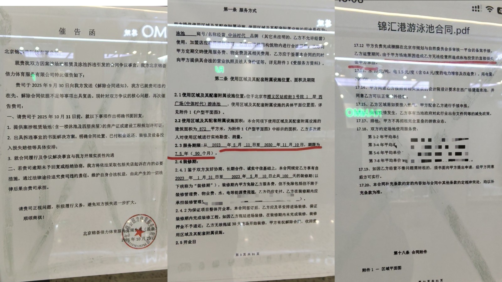 记者随后来到四楼,健身房虽然闭店,但内部健身器材仍完好留存。记者注意到,场馆内玻璃上张贴着中体倍力游泳健身针对锦荟港物业的催告函,回应了此前物业以拖欠房租物业费为由要求解除合同的诉求。同时,中体倍力游泳健身还贴出了自己与锦荟港物业的泳池合同,并划线了部分条款——“甲方负责完成棚膜在北京市规划与自然委员会多审核一平台的备案手续,乙方运营期间,由于甲方场地原因造成乙方无法经营所造成泳游池投资的直接损失由甲方承担”。