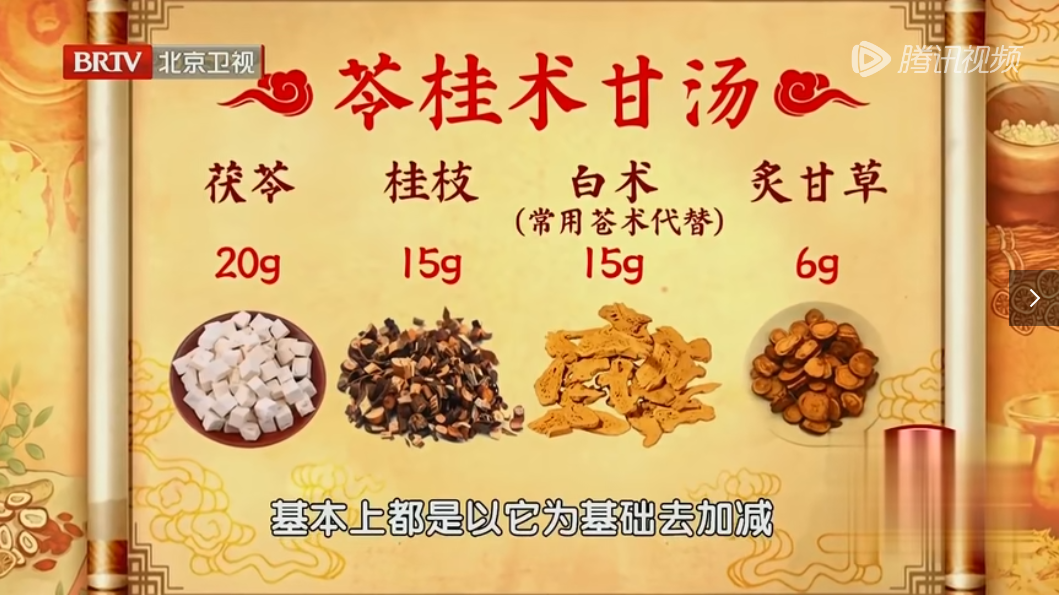 茯苓20g,桂枝15g,白术(常用苍术代替)15g,炙甘草6g。
