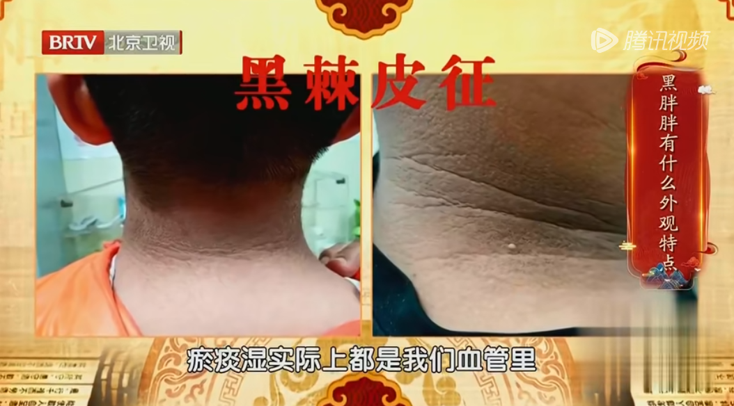 黑胖子在皮肤表面会出现黑棘皮征,瘀痰湿会互相转化,导致脾虚痰湿内生,影响气机运行,瘀血产生后与痰湿互相搏结,形成了黑棘皮征。