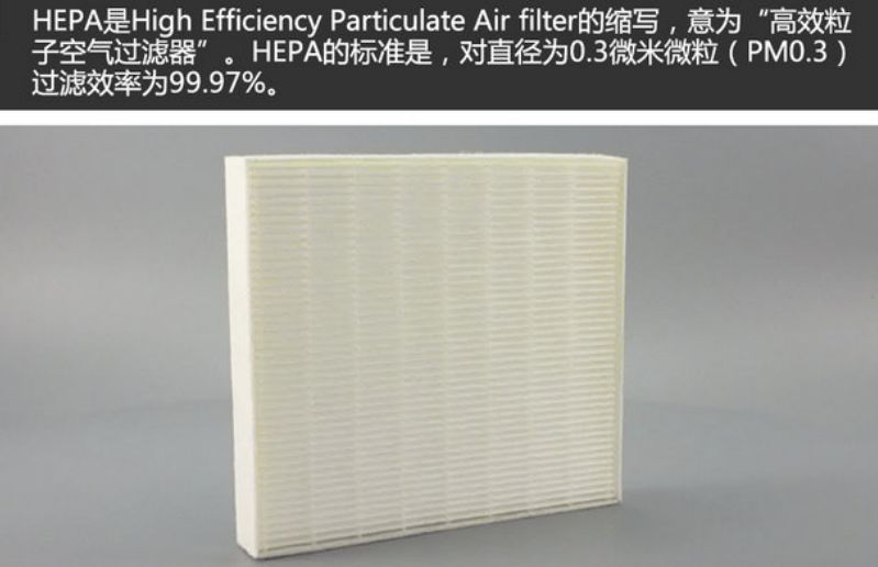 HEPA是HighEfficiencyParticulateAirfilter的缩写,意为“高效粒子空气过滤器”。HEPA的标准是,对直径为0.3微米微粒(PM0.3)过滤效率为99.97%。