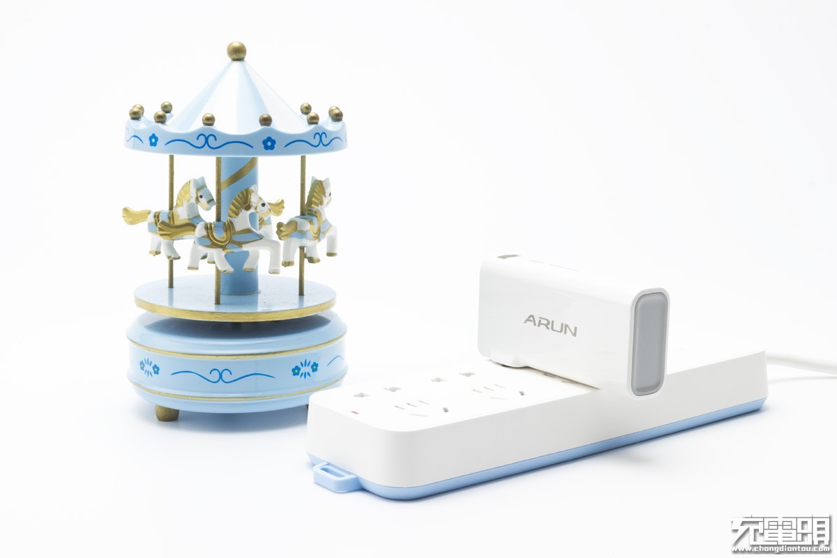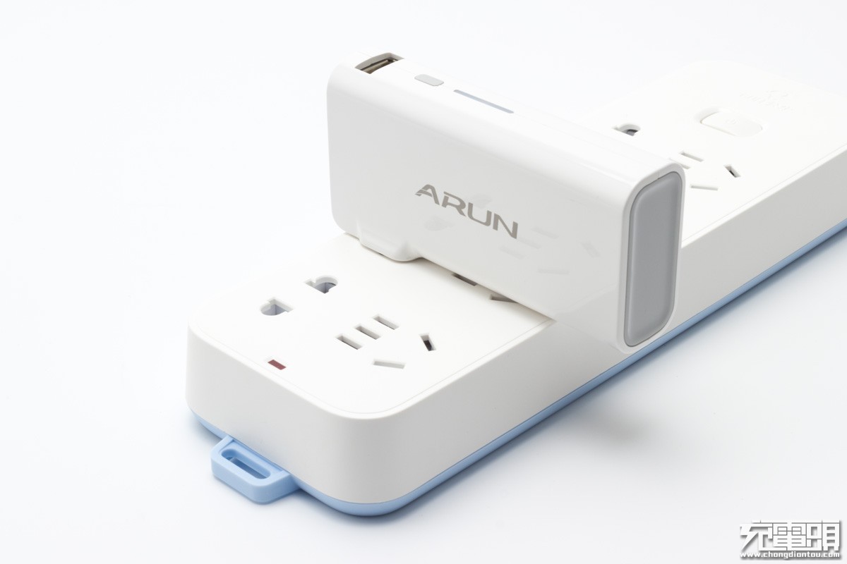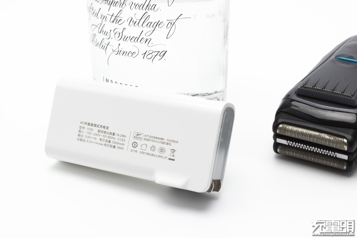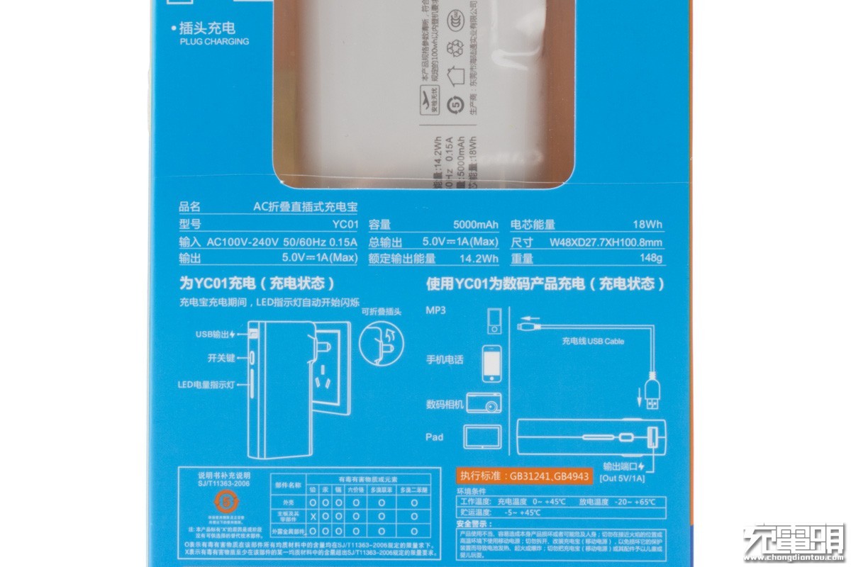 首先,它是充电器。自带可折叠AC直插式插头插上电源,电子设备接入充电器的USB输出接口即可充电。机身带有一个USB输出接口,输出规格为5V1A。输入电压100-240V,适应全球电压标准。