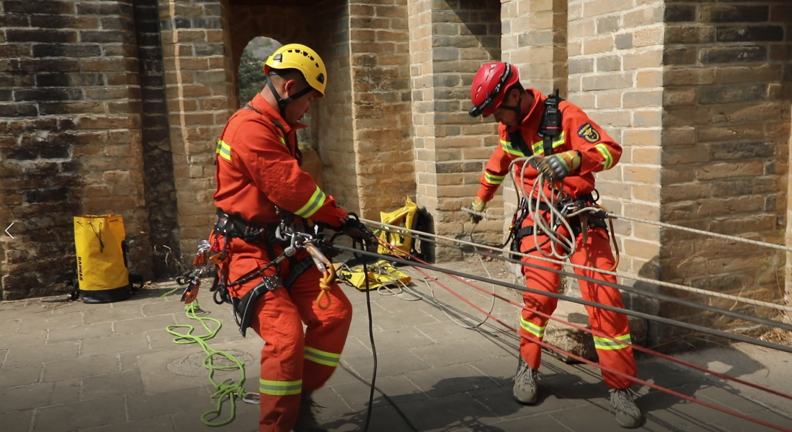 根据现场情况,消防救援人员迅速制定营救措施,选择烽火台的一个垛口作为作为支点,利用绳索、滑轮和固定器等设备迅速搭建绳索系统,两名队员携带多功能担架索降到“被困者”位置。